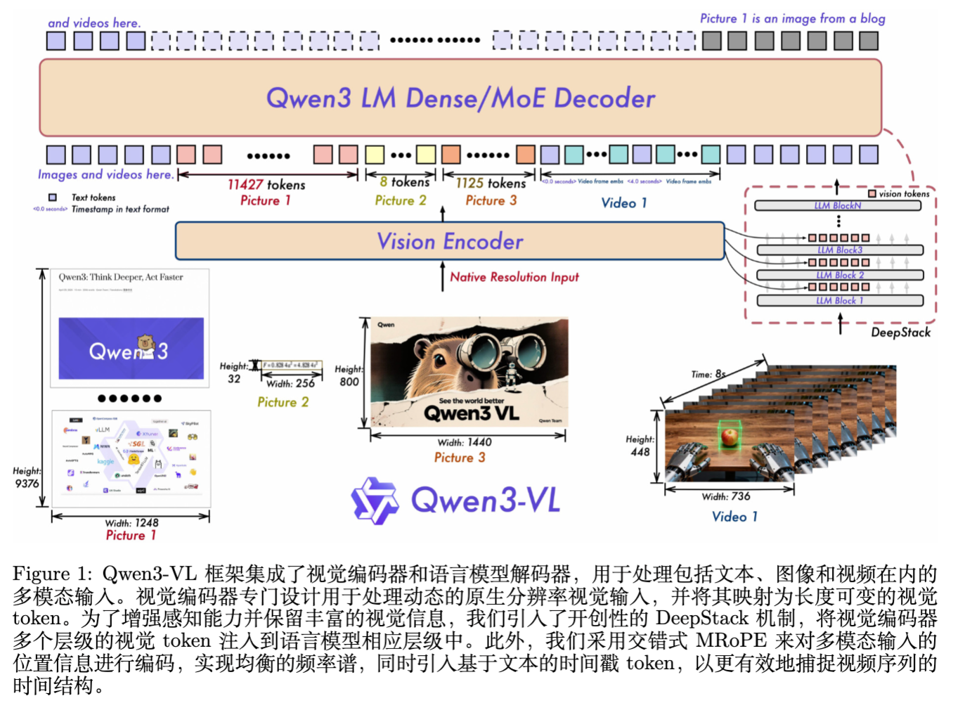 架构升级: 引入 Interleaved-MRoPE 以解决长视频理解中的频谱偏差问题;采用 DeepStack 机制将多层视觉特征注入 LLM 层以增强细粒度感知;视频时间对齐从绝对位置编码转变为基于文本的时间戳(Text-based Video Timestamps)。 -