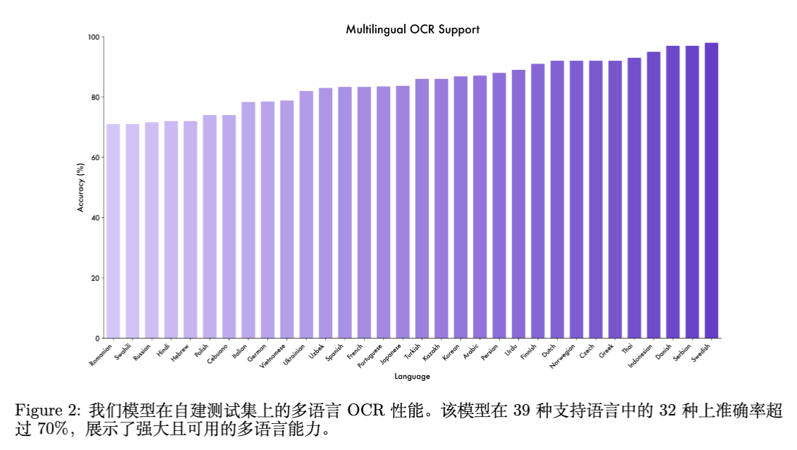 多语言 OCR: 在自建的 39 种语言测试集中,模型在 32 种语言上准确率超过 70%。 -
