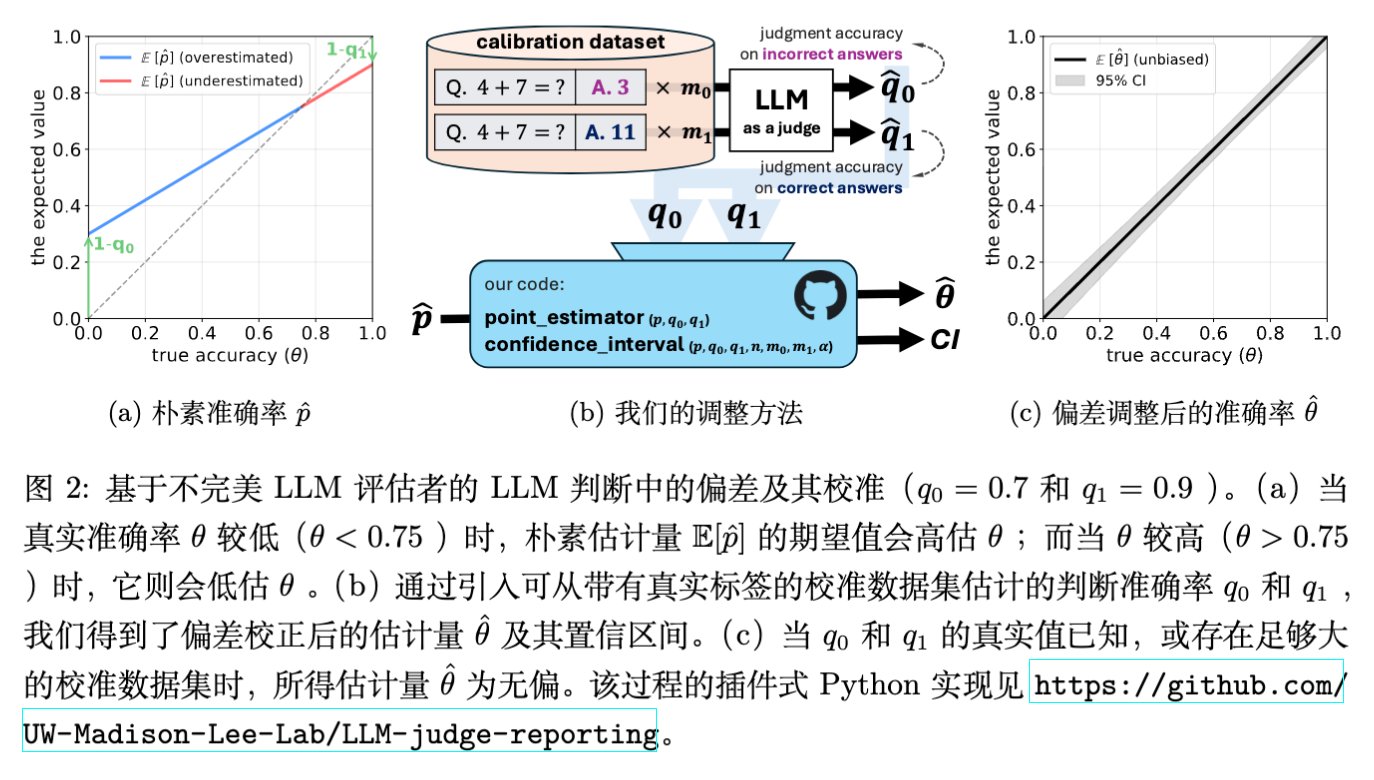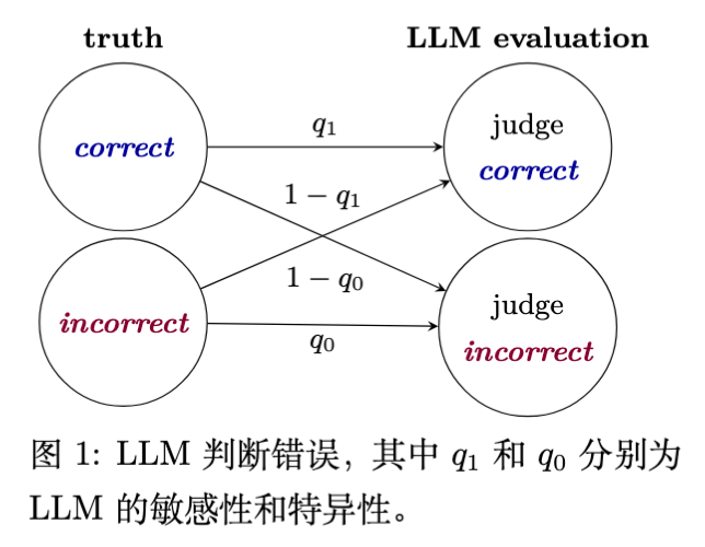 在大语言模型(LLM)评估领域,使用 LLM 作为评判者(LLM-as-a-Judge)已成为一种通过替代人工评估来降低成本的可扩展方案。然而,由于 LLM 评判者本身存在噪声(即其灵敏度和特异度不完美),直接使用其输出的原始准确率(raw accuracy)会导致对模型真实能力的估计产生偏差。