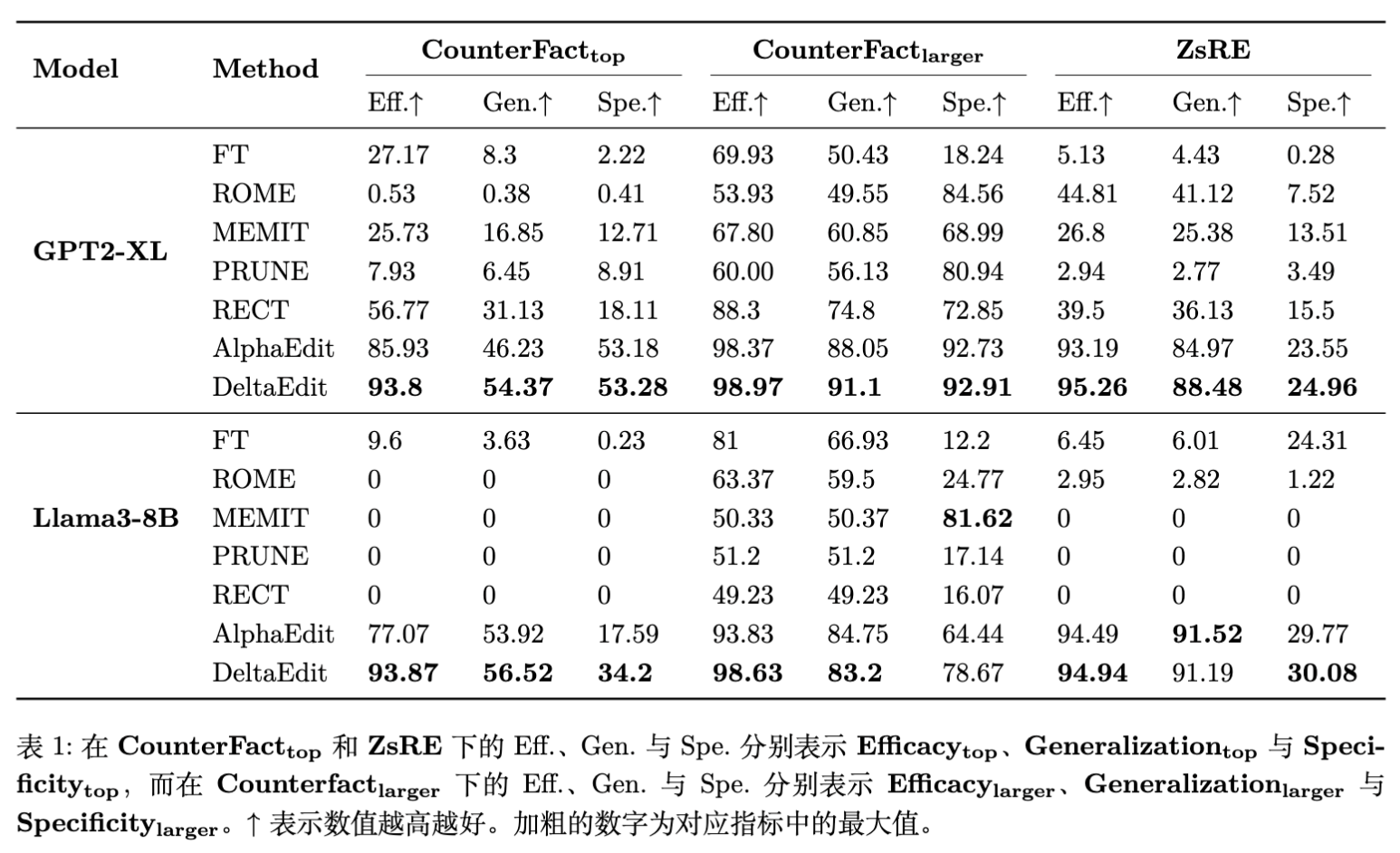 GPT2-XL 的结果:在较小的模型上,AlphaEdit 本身表现已经很好,DeltaEdit 依然取得了更优的结果,但提升幅度相对较小。这可能与小模型的参数空间较小,更容易饱和有关。 -
