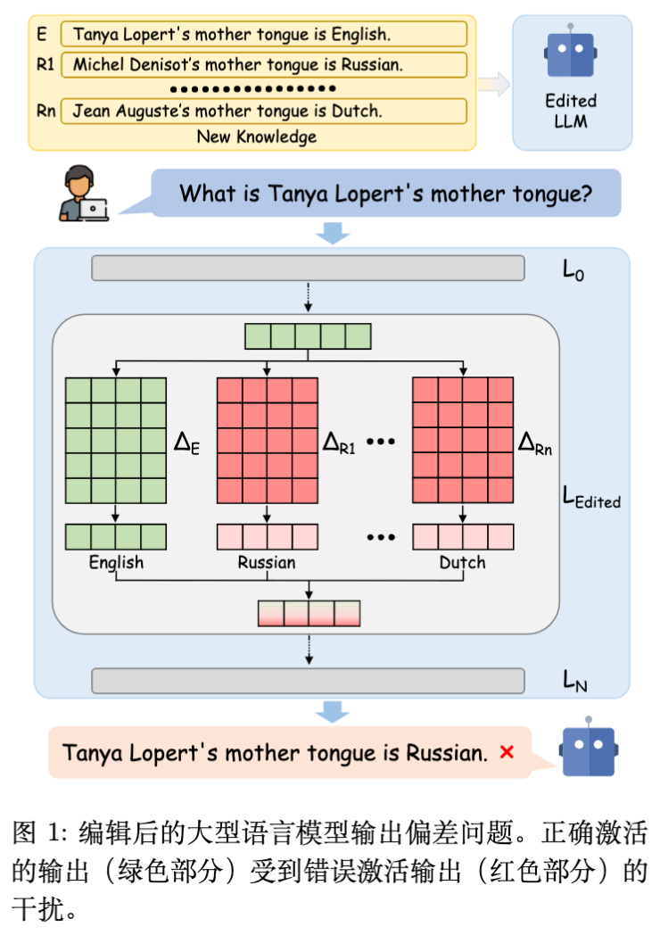 如图 1 所示,随着编辑数量增加,用户的查询不仅激活了正确知识,还激活了大量无关知识(红色部分)。这种无关知识的叠加使得正确输出被掩盖。