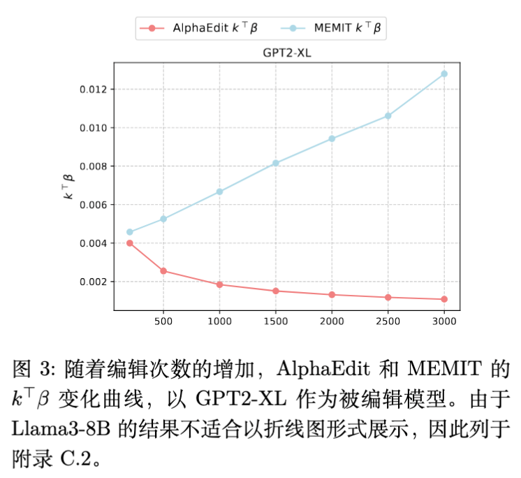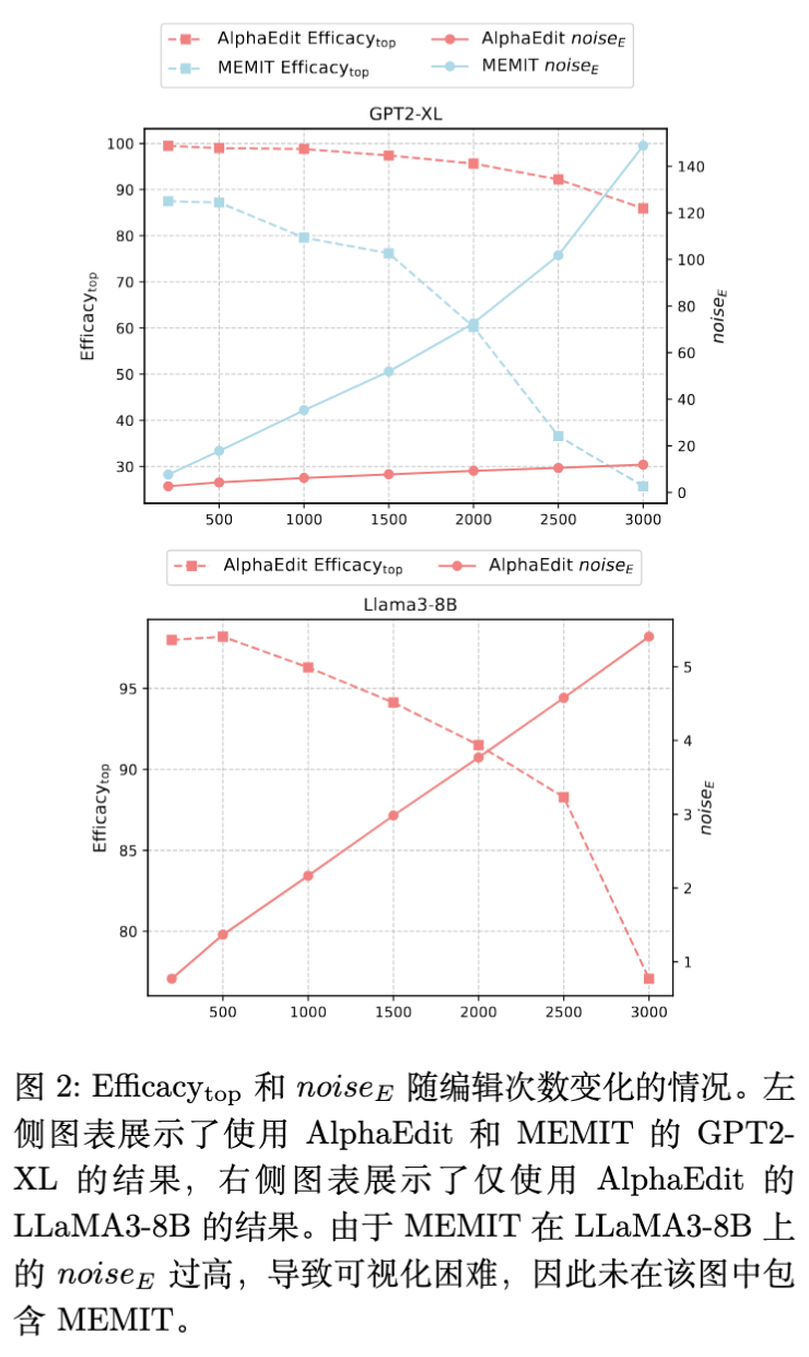 现有的方法如 AlphaEdit 试图通过优化 (例如利用零空间投影)来减小 。实验显示(图 3),AlphaEdit 确实比 MEMIT 获得了更小的 值。然而,随着编辑数量的增加,AlphaEdit 的性能依然会显著下降。