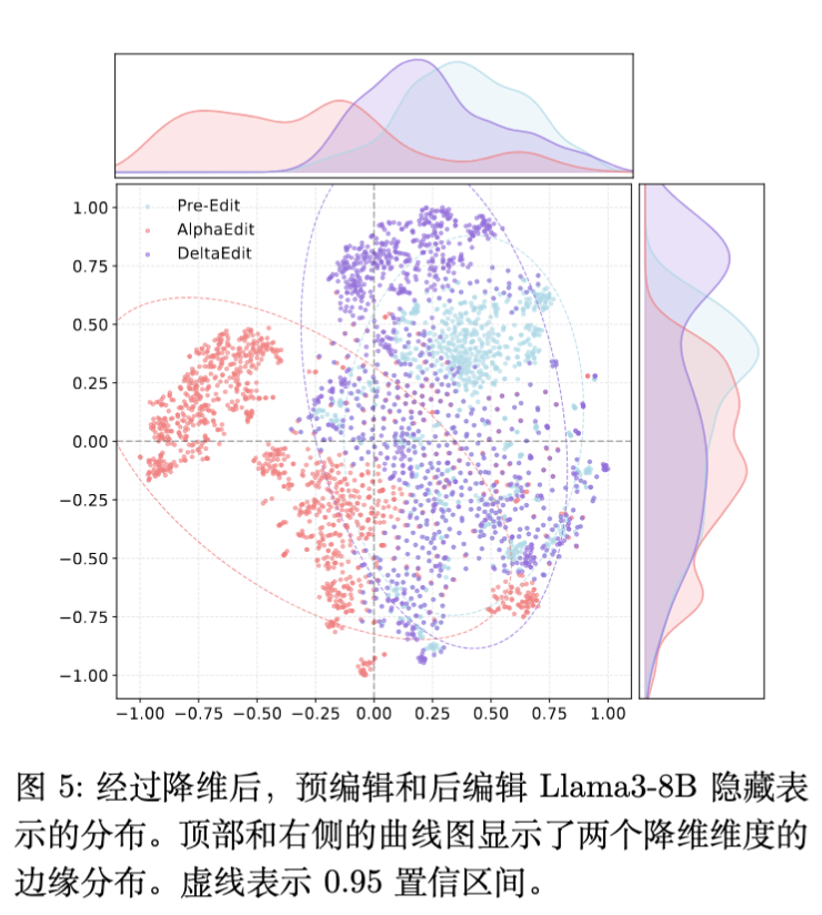 为了探究编辑对模型内部表示的影响,作者提取了 Llama3-8B 在编辑前后的隐藏层表示,并使用 t-SNE 进行可视化。