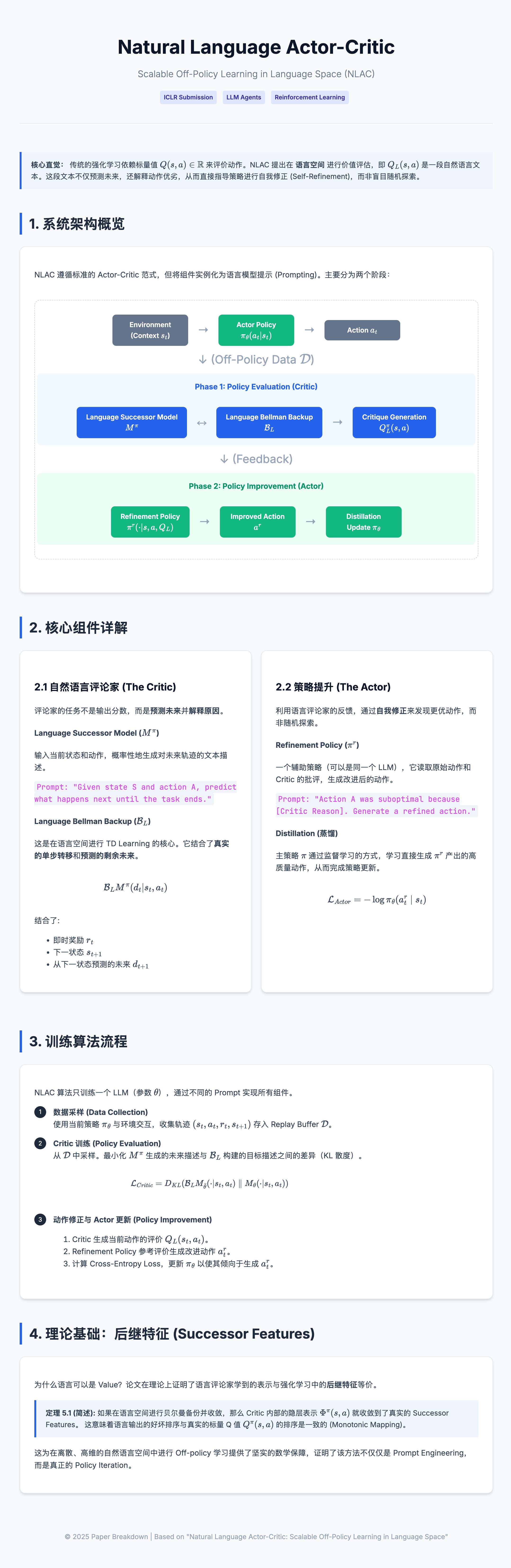 本文介绍了一种名为 Natural Language Actor-Critic (NLAC) 的新型强化学习算法,旨在解决大型语言模型(LLM)Agent 在长程任务中训练不稳定和样本效率低下的问题。与传统的依赖标量奖励的 Actor-Critic 方法不同,NLAC 引入了一个 自然语言评论家 (Natural Language Critic),它不仅评估动作的优劣,还通过预测未来和生成自然语言解释来指导策略改进。