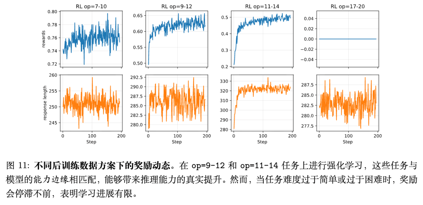论文记录了不同阶段的训练动态。值得注意的是,在 OOD-Hard 任务上,如果预训练基础不足,RL 的 Reward 曲线会呈现完全平坦(Flatline),表明模型根本无法探索到正向奖励;而在“能力边界”任务上,Reward 曲线呈现健康的上升趋势。这从优化角度佐证了“Edge of Competence”理论。