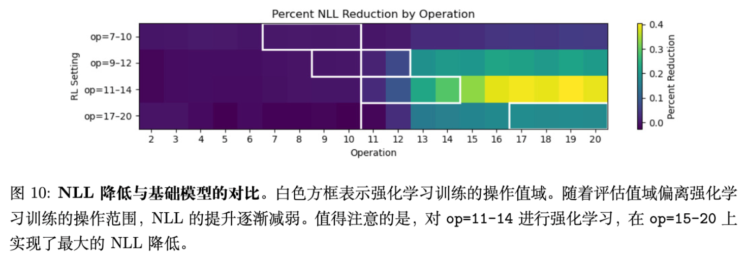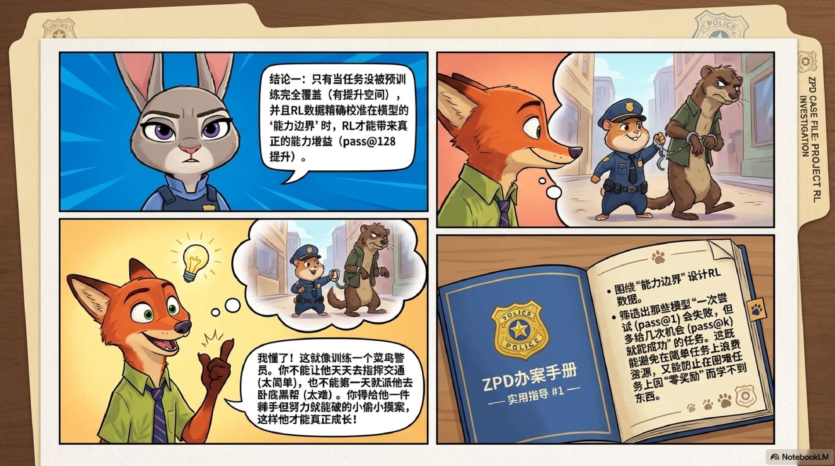 通过分析奖励曲线和负对数似然(NLL)下降情况,研究者发现:在“能力边界”数据上进行 RL 训练,能带来最大的 NLL 下降,且这种下降能平滑地泛化到更难的操作区间。这反驳了“RL 无法泛化”的悲观论点,同时也修正了“RL 无所不能”的盲目乐观,强调了数据难度课程(Curriculum)的重要性。