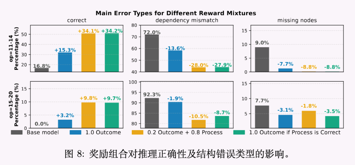 纯结果奖励:虽然能提升 pass@1,但伴随着大量推理逻辑错误(Intermediate Steps Error,见图 8)。模型倾向于走“捷径”。 -