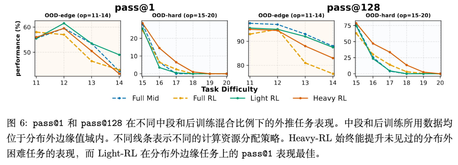 OOD-Hard 任务:随着任务难度增加,Heavy-RL(即保留少量预算用于中期训练建立基础,大部分预算用于 RL 探索)开始占据优势。单纯的中期训练在极难任务上表现不佳,因为缺乏探索机制。 -