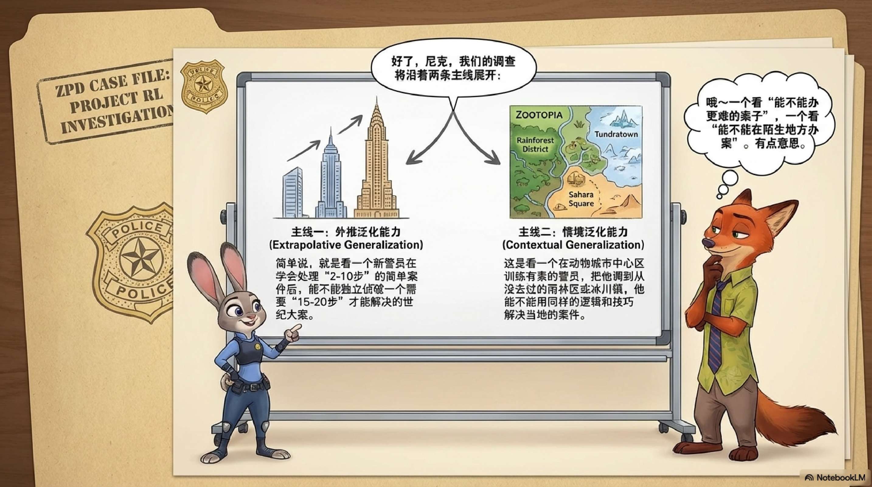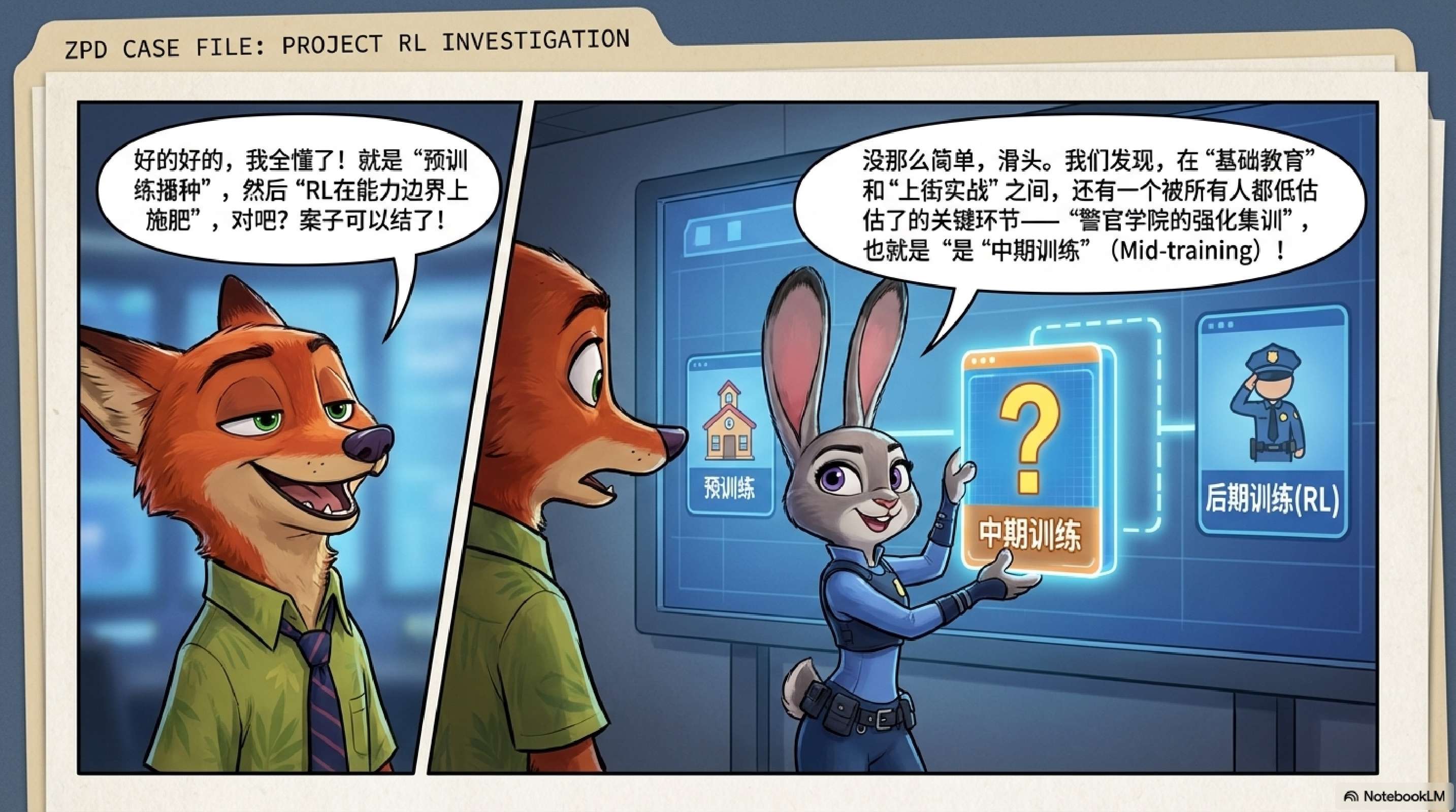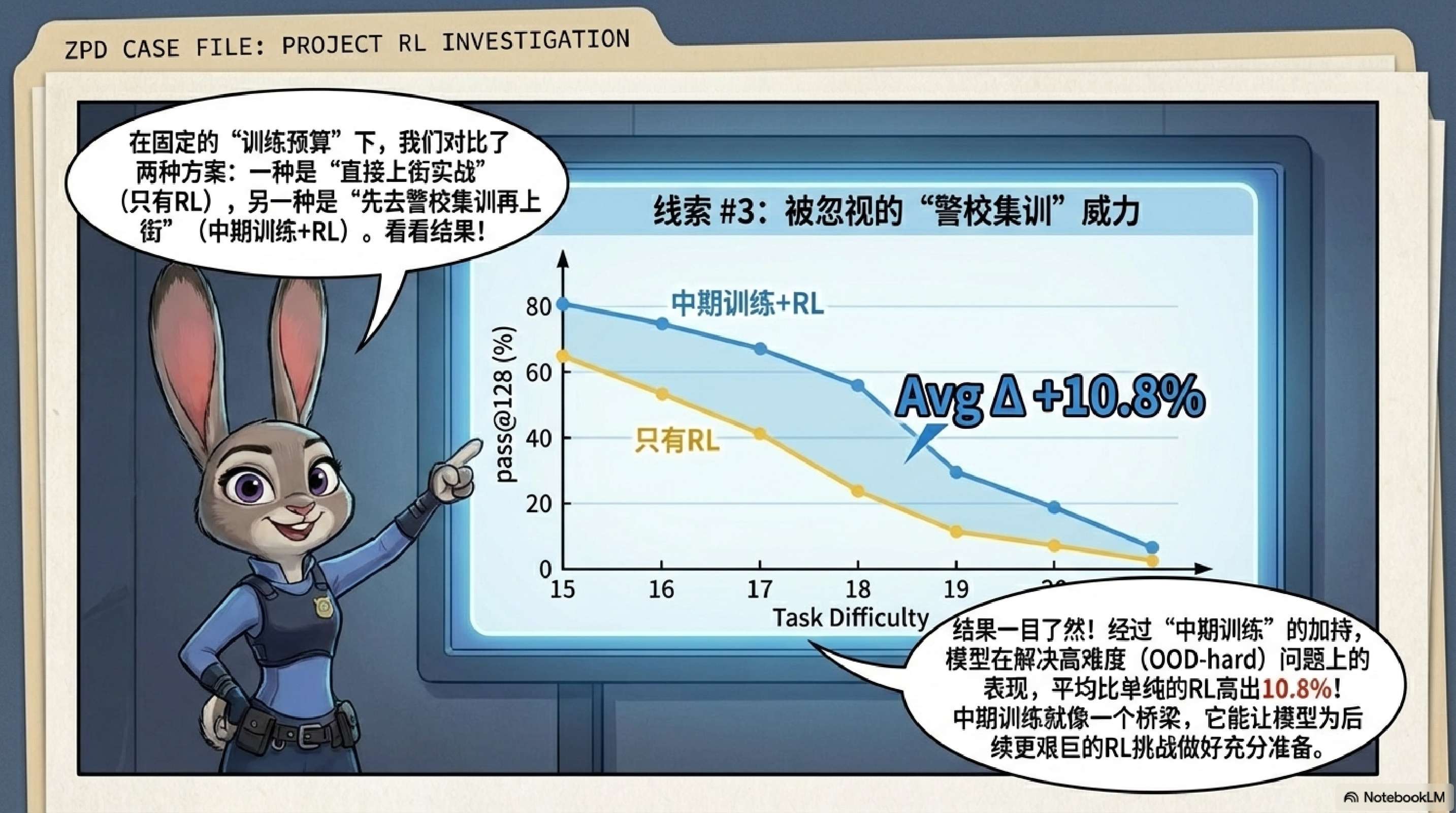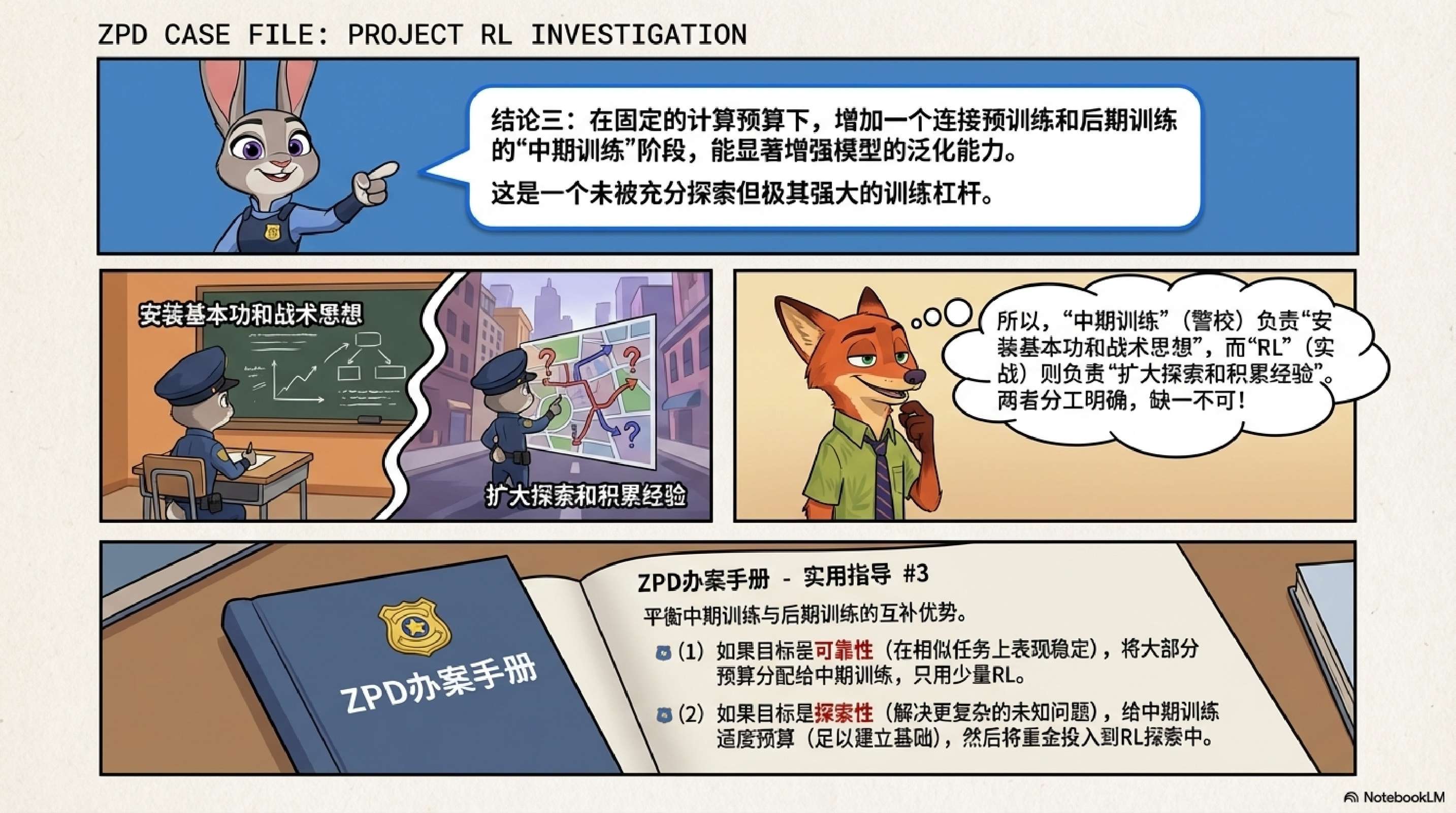 中期训练的关键作用:在固定计算预算下,引入连接预训练和 RL 分布的中期训练阶段,能显著提升模型在域外(OOD)任务上的表现。中期训练负责确立先验(Priors),RL 负责规模化探索(Exploration)。 -