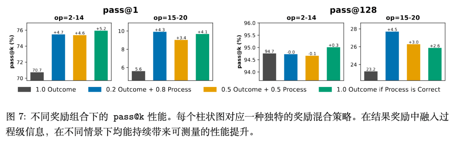 混合/过程奖励:引入过程监督()虽然在初期可能使得优化变慢,但在高难度 OOD 任务上最终能获得更高的性能( pass@1提升 4-5%)。 -