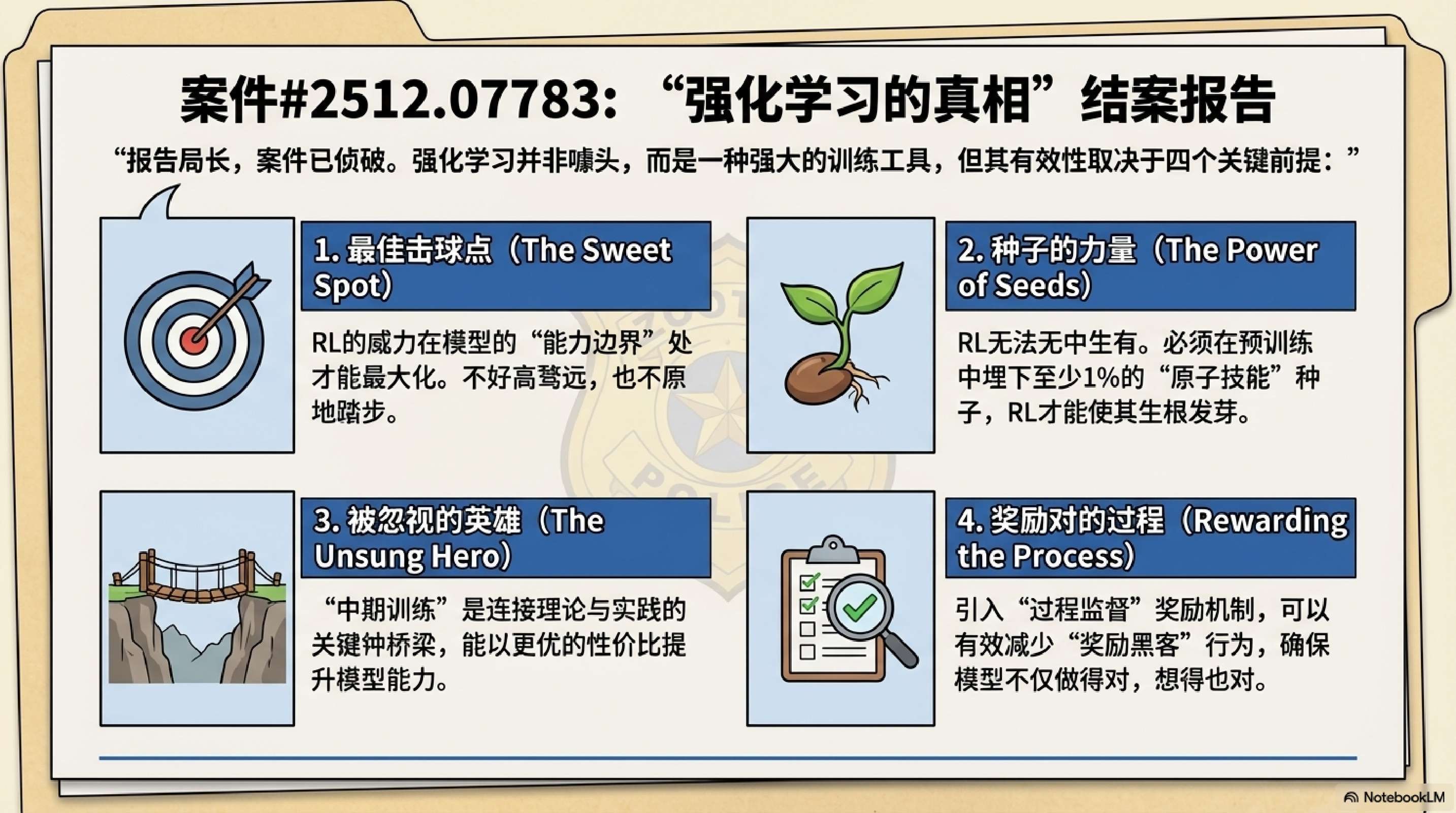 本研究通过一个严谨的受控实验框架,清晰地描绘了预训练、中期训练和 RL 在构建推理模型中的分工与协作。主要结论与建议如下: