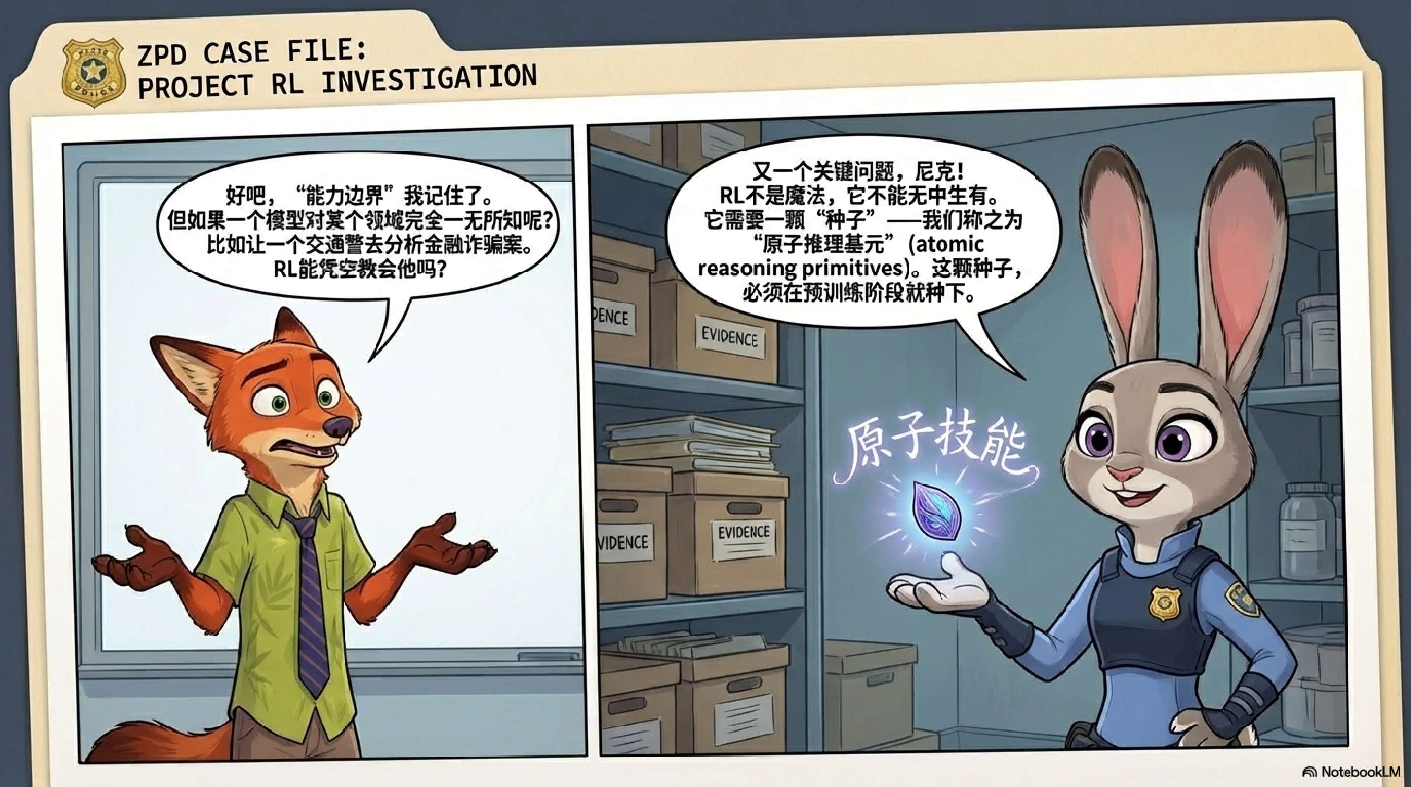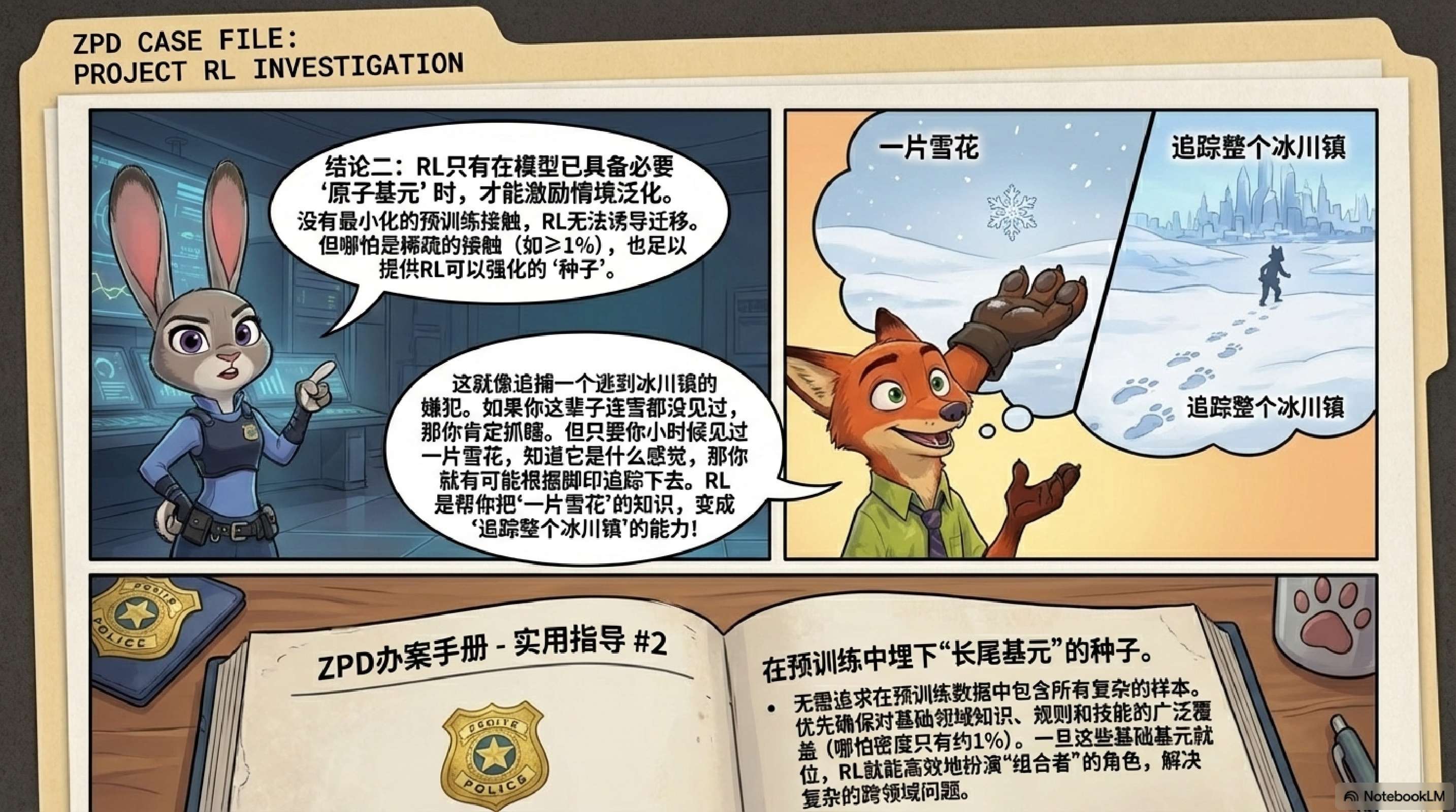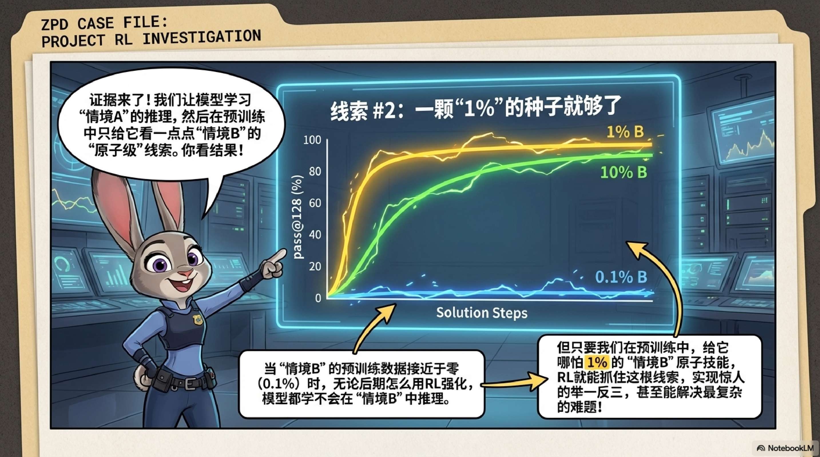 结论:RL 激励上下文泛化的前提是基座模型中存在必要的原语(Primitives)。RL 无法从零创造对新上下文的理解,但能极好地放大微弱的信号。预训练只需覆盖广泛的“原子知识”(哪怕是长尾的),RL 就能负责将其组合起来解决复杂问题。