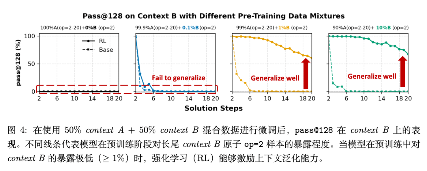 0% 或极低暴露(0.1%):如果预训练中完全没有 Context B,或者仅有 0.1% 的暴露,即便 RL 阶段包含了大量 Context B 数据,模型也无法实现有效的泛化。RL 难以在真空中建立新的语义映射。 -