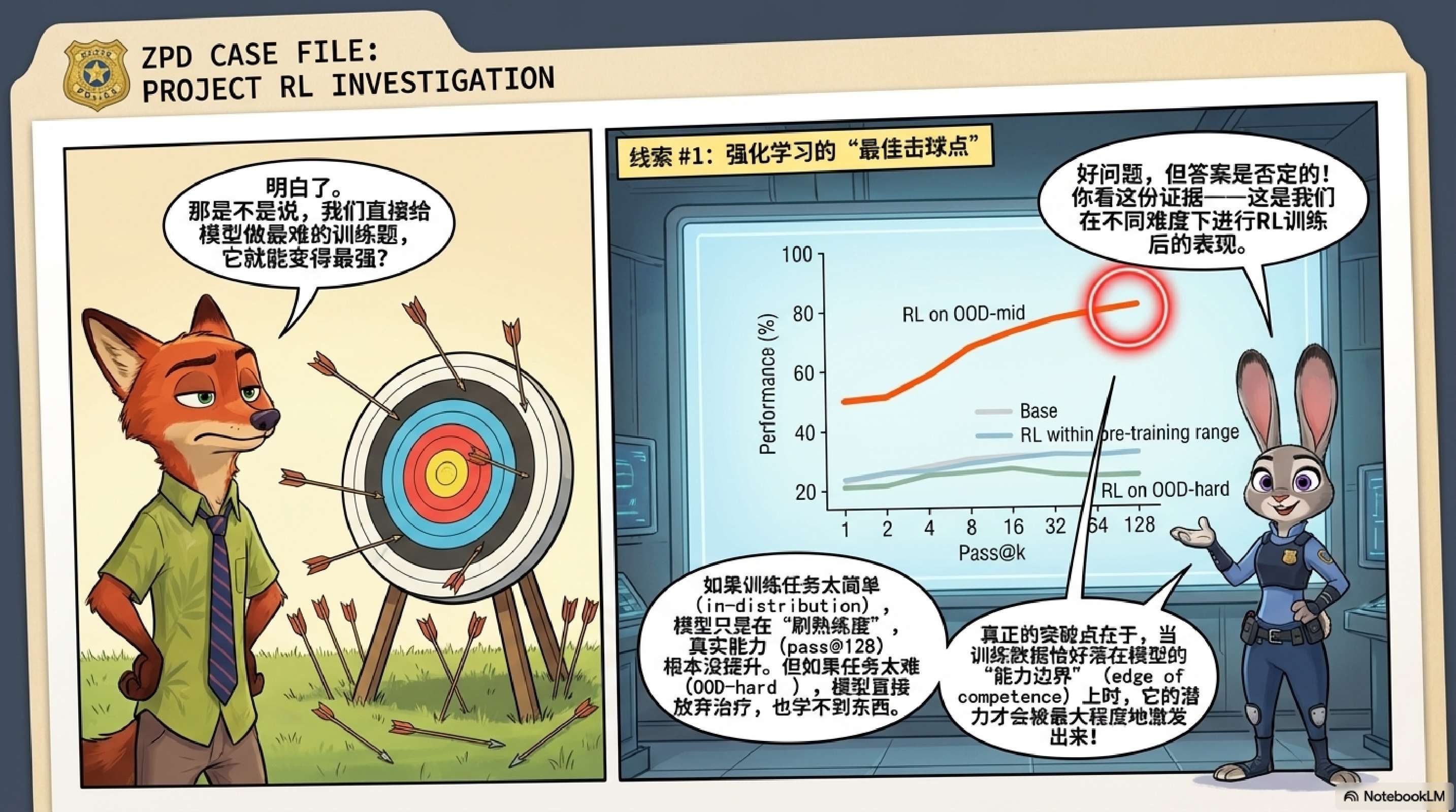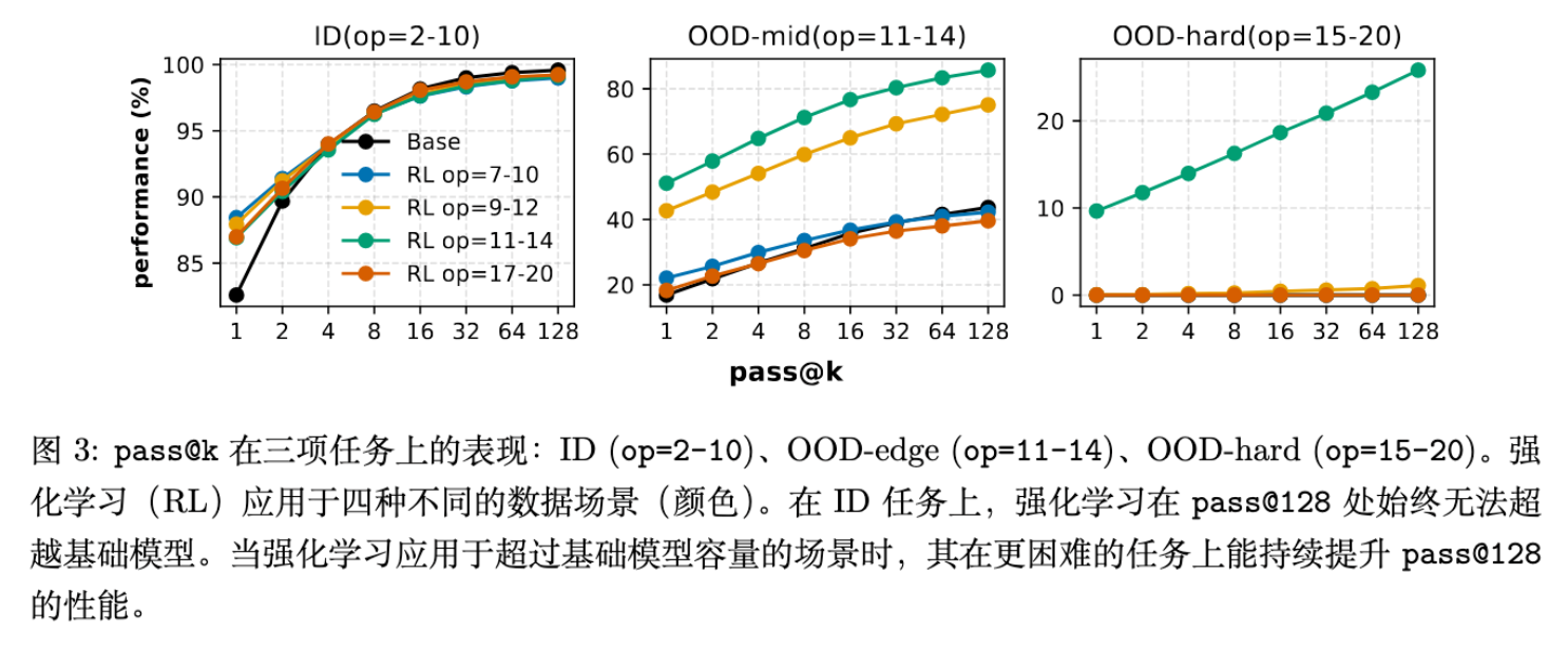RL 的真实增益条件:RL 仅在任务难度处于模型“能力边界(Edge of Competence)”且预训练阶段留有足够探索空间时,才能产生真正的外推性能力提升(Pass@128)。对于已完全掌握的域内任务或完全超出能力的域外任务,RL 效果有限。 -