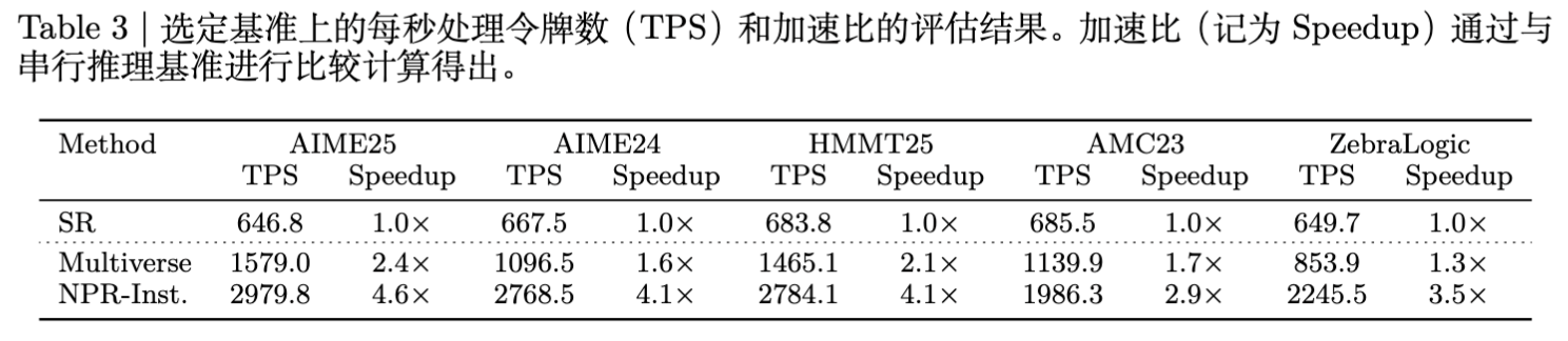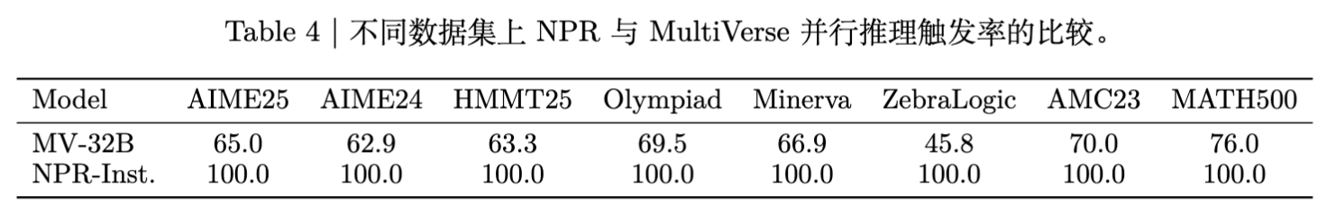 NPR:在所有八个基准测试中均保持 100.0% 的并行触发率。这证明了 NPR 的三阶段训练范式成功地将并行推理内化为模型的默认认知模式,而非简单的模仿。