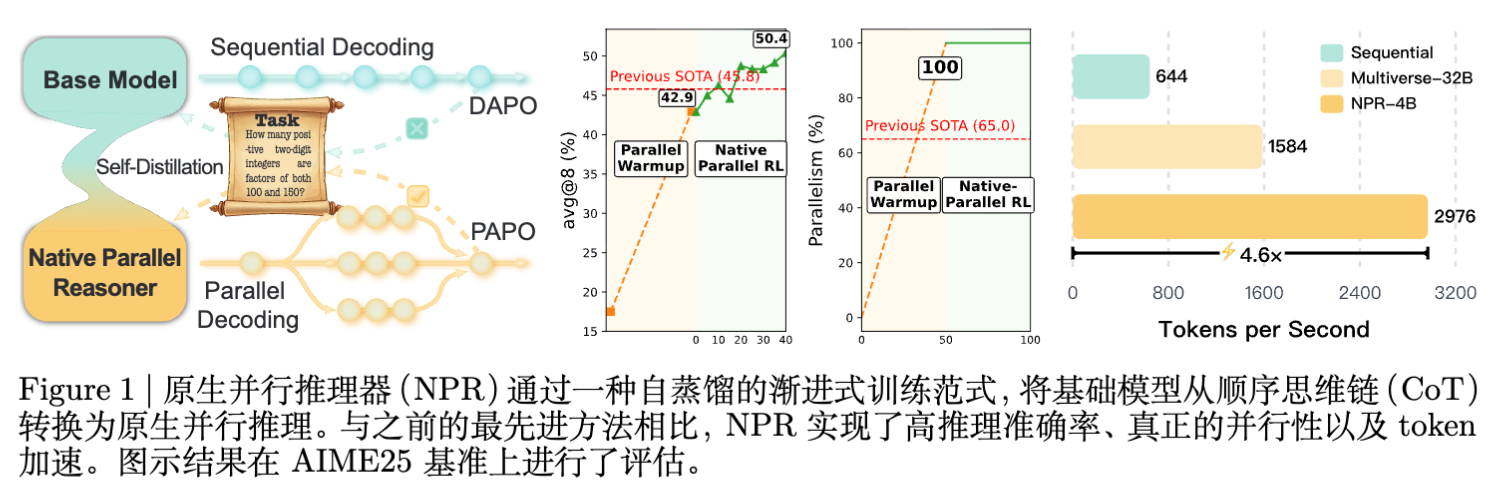 Teacher-free 范式:不依赖 GPT-4 或 DeepSeek 等更强模型的蒸馏,仅凭自身演化出并行能力。 -