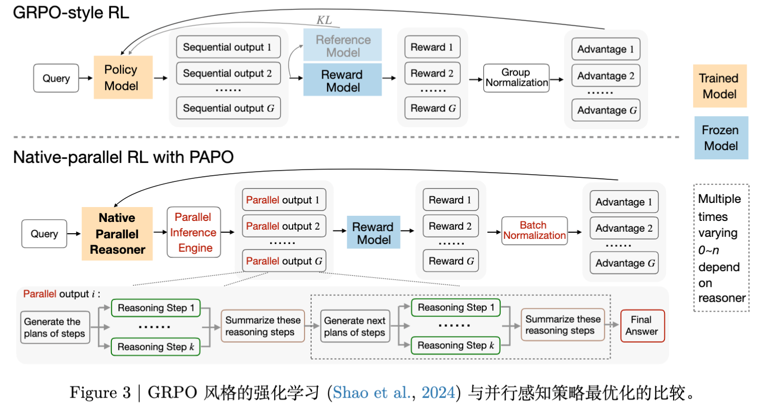 在此阶段,团队发现现有的 RL 算法(如 PPO, GRPO)直接应用于并行生成时存在严重问题,因此提出了 Parallel-Aware Policy Optimization (PAPO) 。