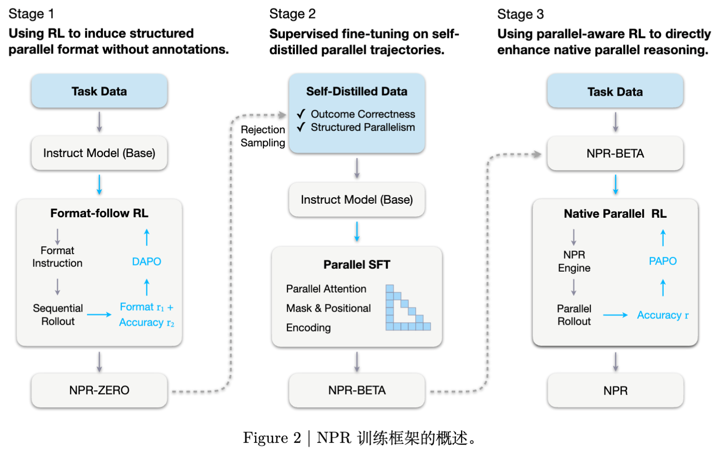 阶段一:格式跟随强化学习(Format-follow RL)。使用 DAPO 算法,通过格式奖励诱导模型输出结构化的并行格式(NPR-ZERO)。 -