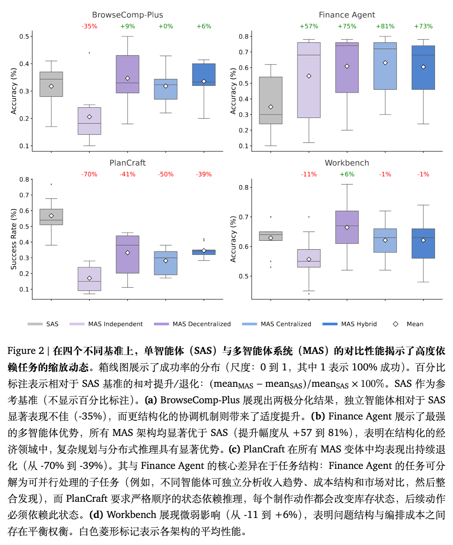 Finance Agent: 所有 MAS 架构均显著优于 SAS(+57% 至 +81%)。这是因为该任务可分解为并行的子任务(如分别分析收入趋势、成本结构),适合协作。 -