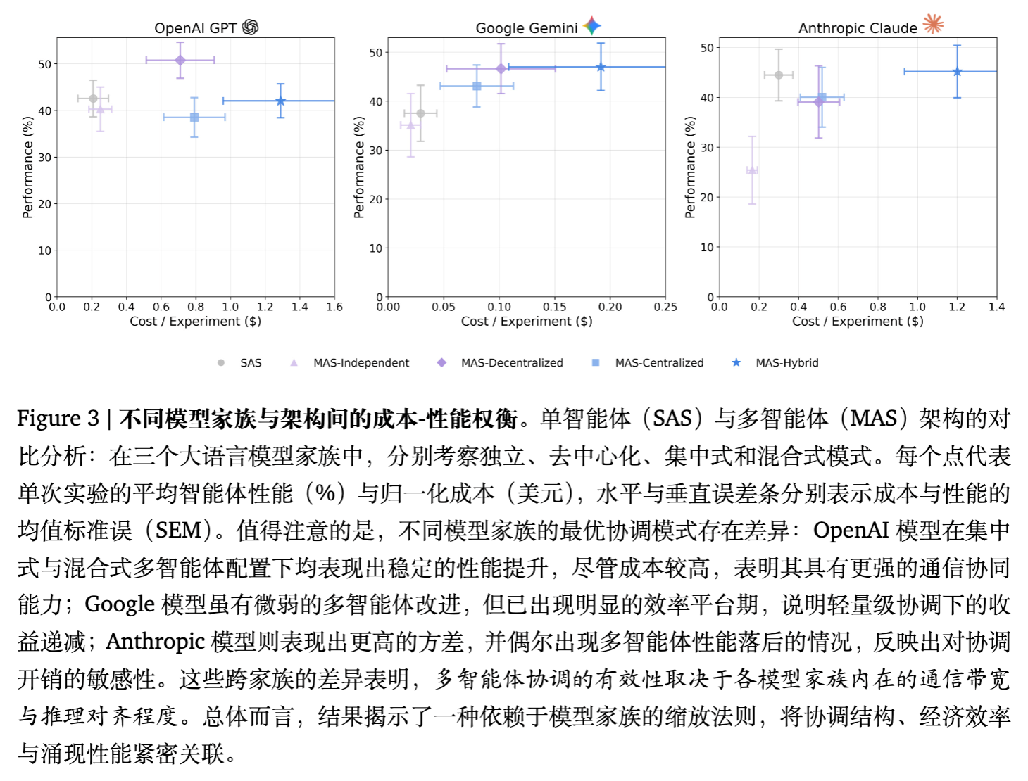 Google: 在 Finance Agent 上提升幅度最大(+164.3%),但在 PlanCraft 上,其最佳变体仅下降 25.3%(相比其他家更优),显示出其在处理协调开销方面的相对效率。 -