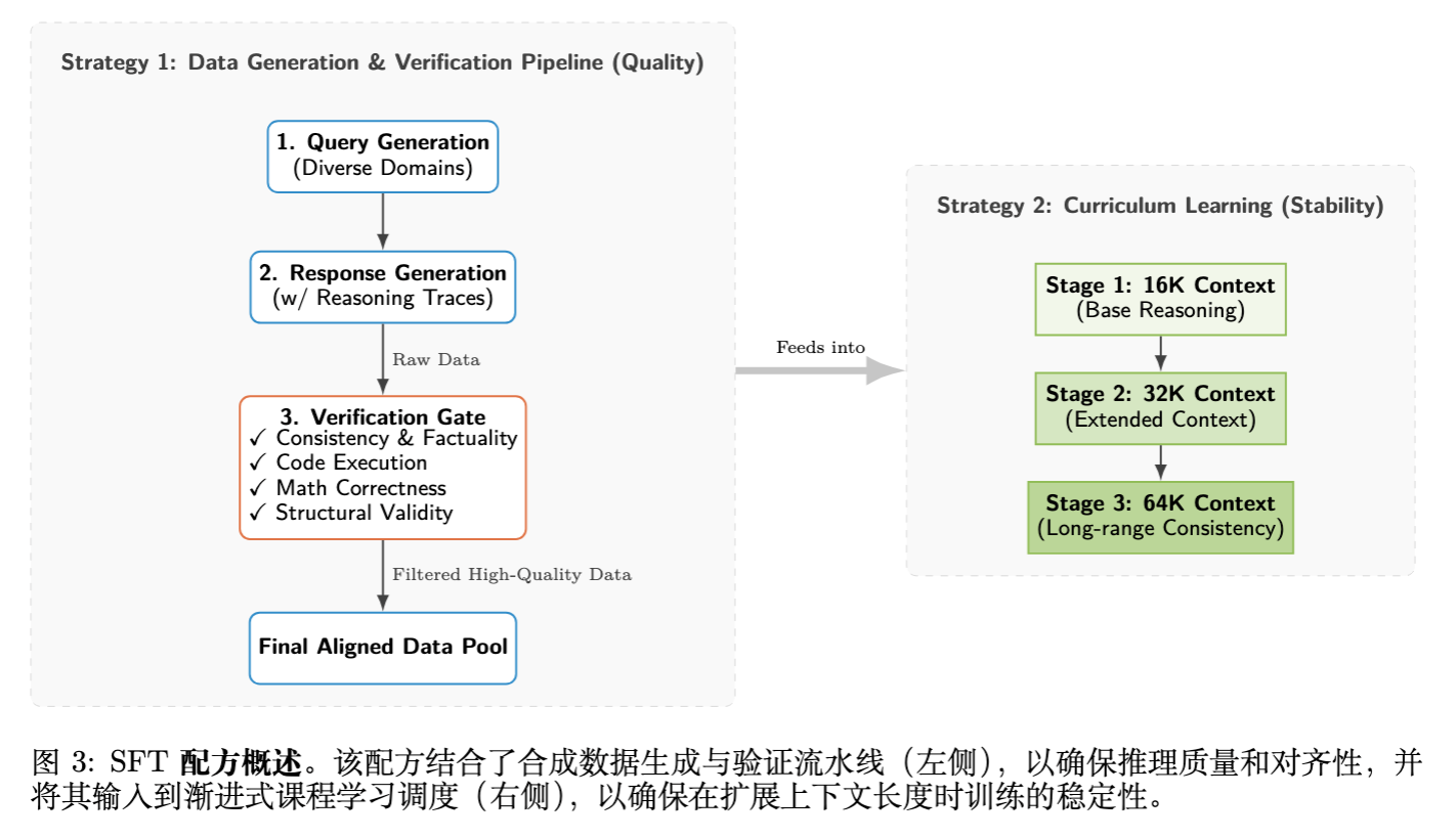 基于上述教训,论文确立了包含数据生成流水线和课程学习计划的 SFT 配方。