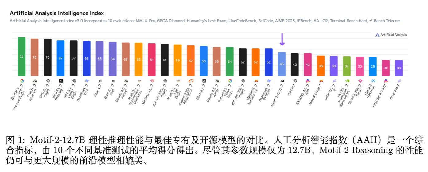 Motif-2-12.7B-Reasoning 的提出旨在解决上述问题。该模型基于 Motif-2-12.7B-Instruct,通过分布对齐的 SFT 和工程化的 RLFT 流水线训练而成。尽管参数量仅为 12.7B,其实验结果显示在多项推理基准上与 30B-40B 参数量的模型相当。本文将详细拆解其训练过程中的关键技术决策、失败教训及最终方案。