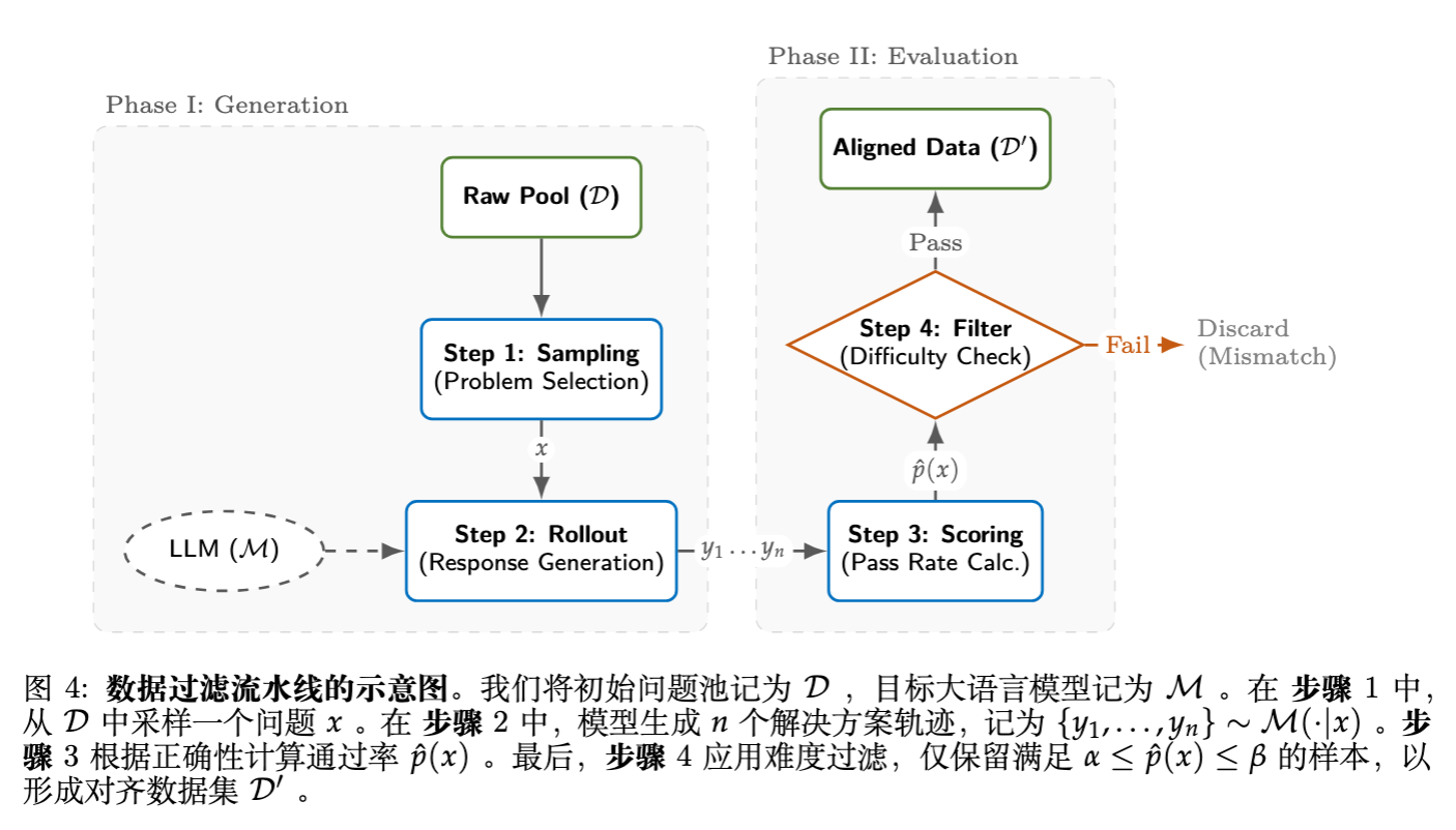 严格过滤:例如在处理 rstar-coder数据集时,基于实证观察,仅选择通过次数在中间范围()的问题,剔除琐碎(trivial)和无法解决(unsolvable)的样本。仅保留验证通过且执行成功的轨迹。