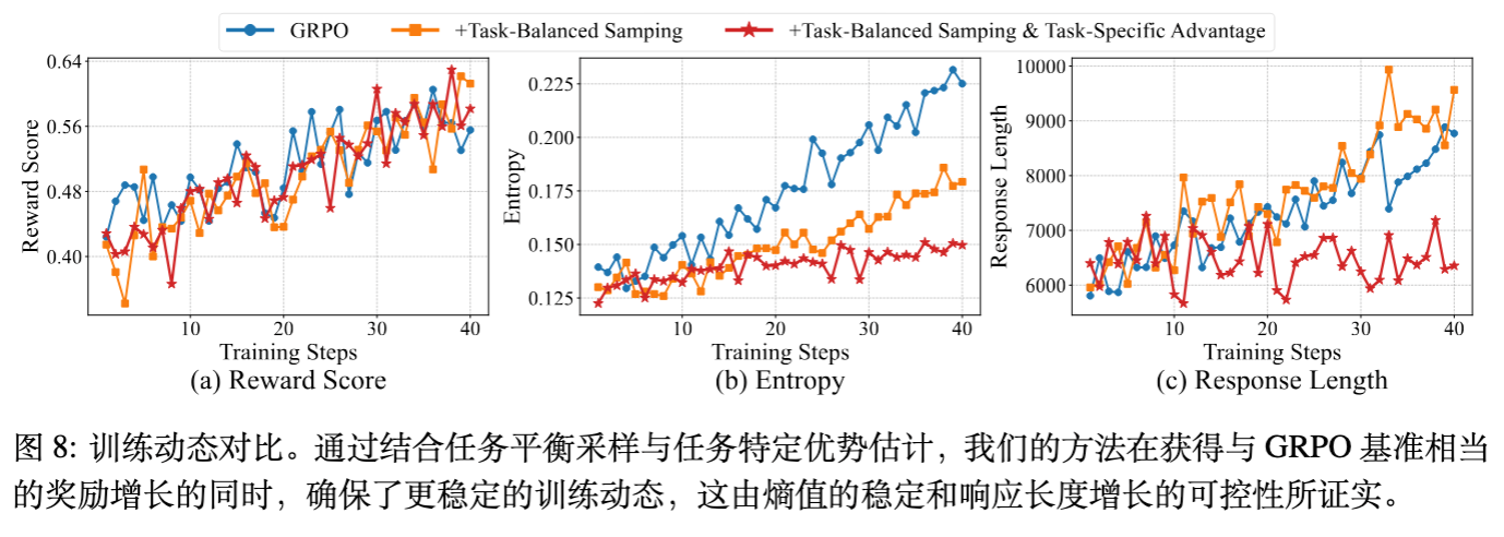 RL 策略:单独使用任务平衡采样提升不大,但结合任务特定优势估计后,模型性能显著提升且熵更稳定。 -