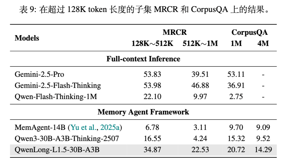 CorpusQA (4M) :得分为 14.29,证明了框架处理 LLM 操作极限之外任务的能力。在此设置下,QwenLong-L1.5 的表现优于其他基于 Agent 的方法。