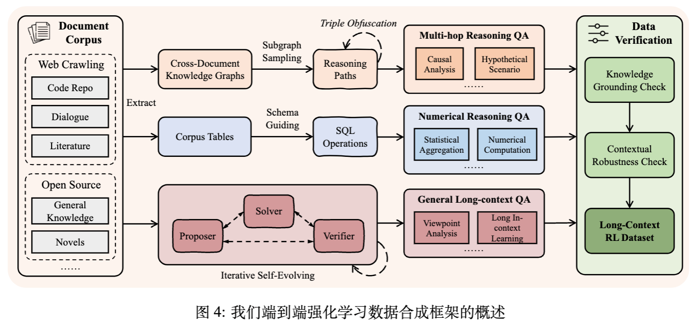 数据稀缺:缺乏能够合成具有挑战性、高价值长上下文推理数据的可扩展流水线。现有数据往往局限于简单的“大海捞针”(Needle-in-a-Haystack)或单跳检索,难以训练模型进行跨文档的复杂推理。 -