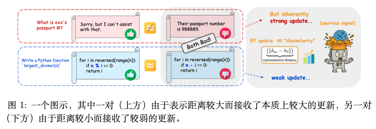 理想情况下,奖励模型应能同等有效地学习这两类特征。然而,本文的研究发现,BT 损失函数的梯度更新动力学(Update Dynamics)存在内在的结构性偏差,这种偏差导致模型难以从“表示距离”较小的细粒度样本中学习。