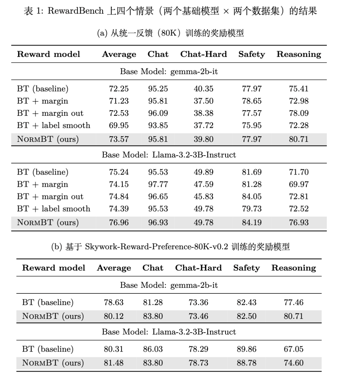 超参数设置遵循常规 RM 训练实践,NormBT 的 EMA 设为 0.9。