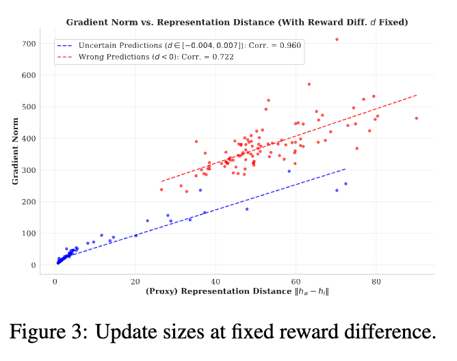 我们在训练 Reward Model (RM) 时,通常认为只要模型判对了(accuracy 高),或者 margin 够大,训练就很稳。但作者推导出一个被忽略的项:梯度的模长不仅取决于预测误差 ,还正比于正负样本在最后一层的特征距离 。