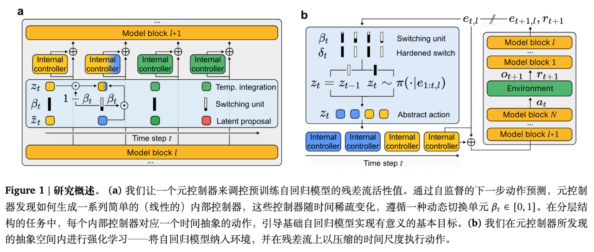 本文探讨了一个替代假设:自回归模型在预训练过程中,为了更准确地预测下一个 token,已经在其内部激活(Internal Activations)中隐式地学习了时序抽象。 如果这一假设成立,我们就不需要从头学习抽象动作,而是只需要提取并利用模型内部已有的抽象表示。