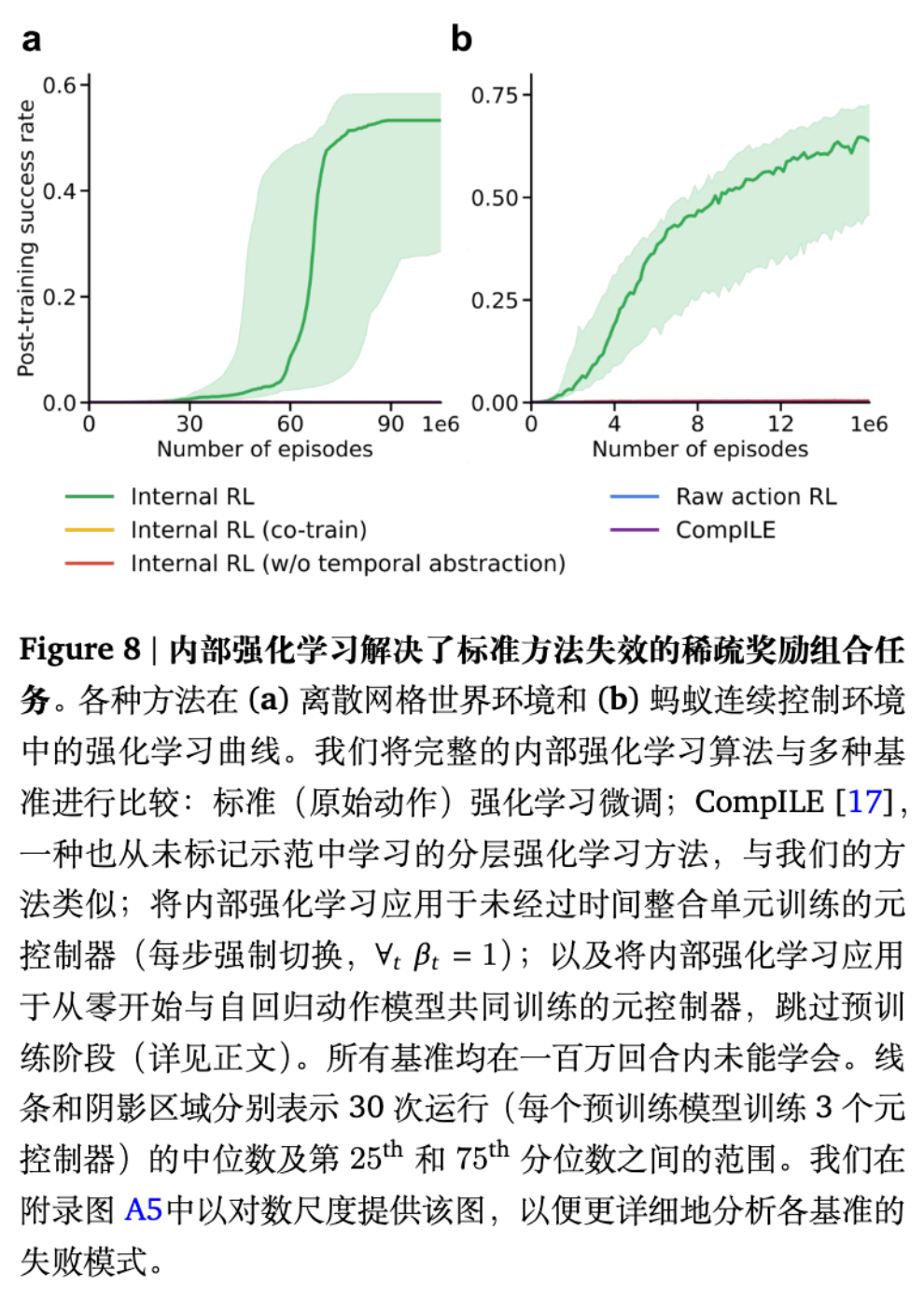 算法上,Internal RL 采用了改进版的 PPO/GRPO,去除了 Critic 网络(使用蒙特卡洛回报估计),以适应稀疏奖励设定。