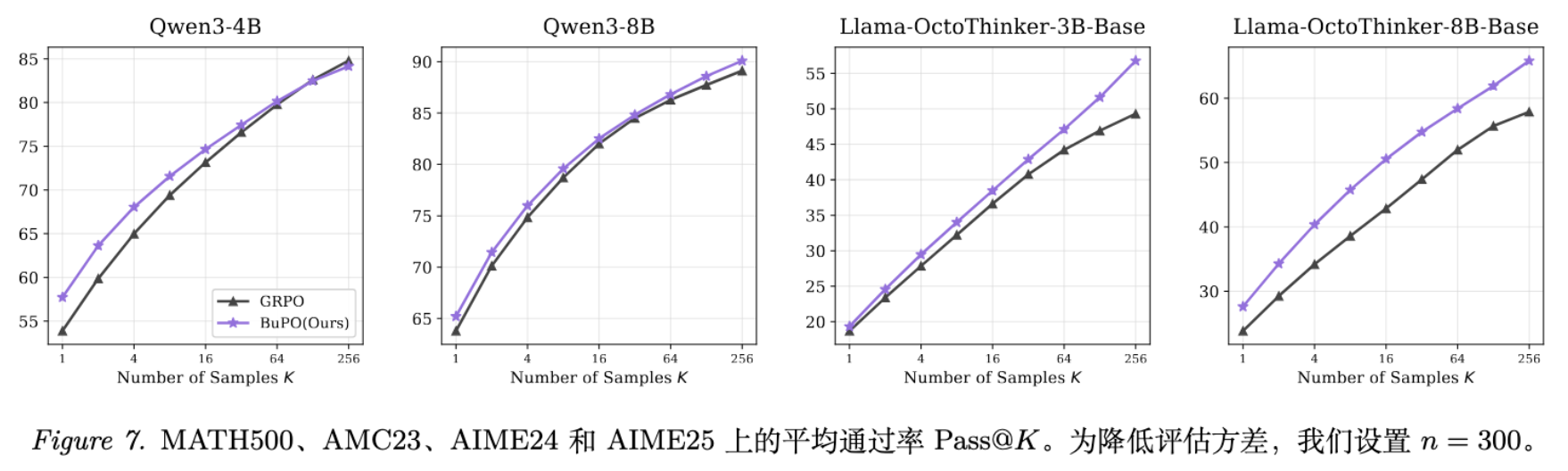 值得注意的是,BuPO 不仅提升了 Pass@1,在 Pass@K (K=1~256) 的整个曲线上都保持了优势。这说明模型生成的每一个样本的质量普遍提高了,而不是仅依靠运气。
