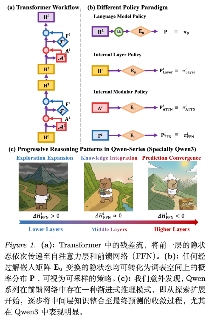 可解释性研究(Interpretability)已经表明,Transformer 的残差流(Residual Stream)中蕴含着丰富的信息,且随着层数加深不断演化。Logit Lens 等工具揭示了我们可以将中间层状态映射到词表空间进行解码。然而,现有的 RL 算法很少利用这些内部信息来指导优化过程。