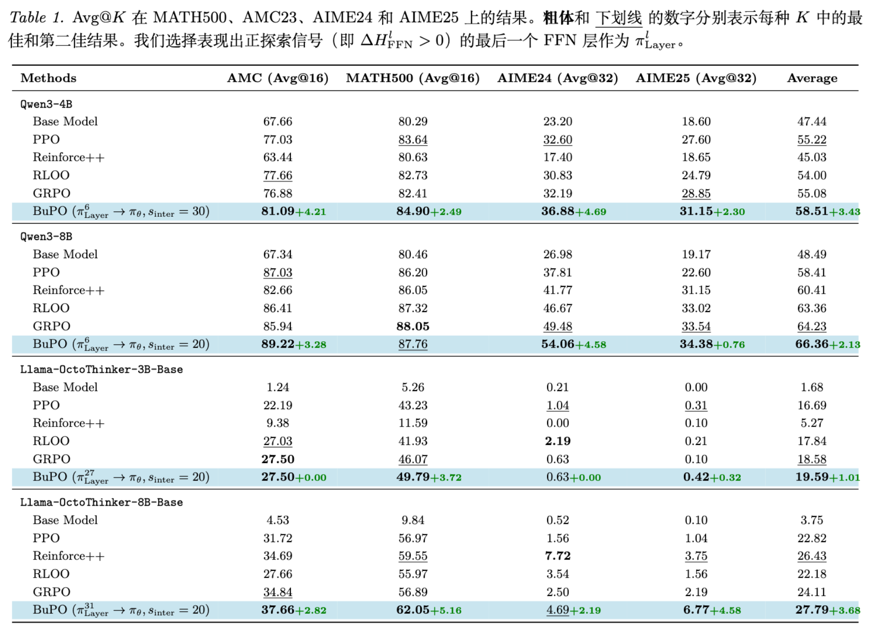 Qwen3-4B:BuPO 在 AIME24 上比 GRPO 提升了 4.69 分,在平均分上提升了 3.43 分。 -