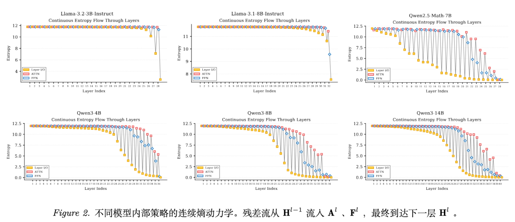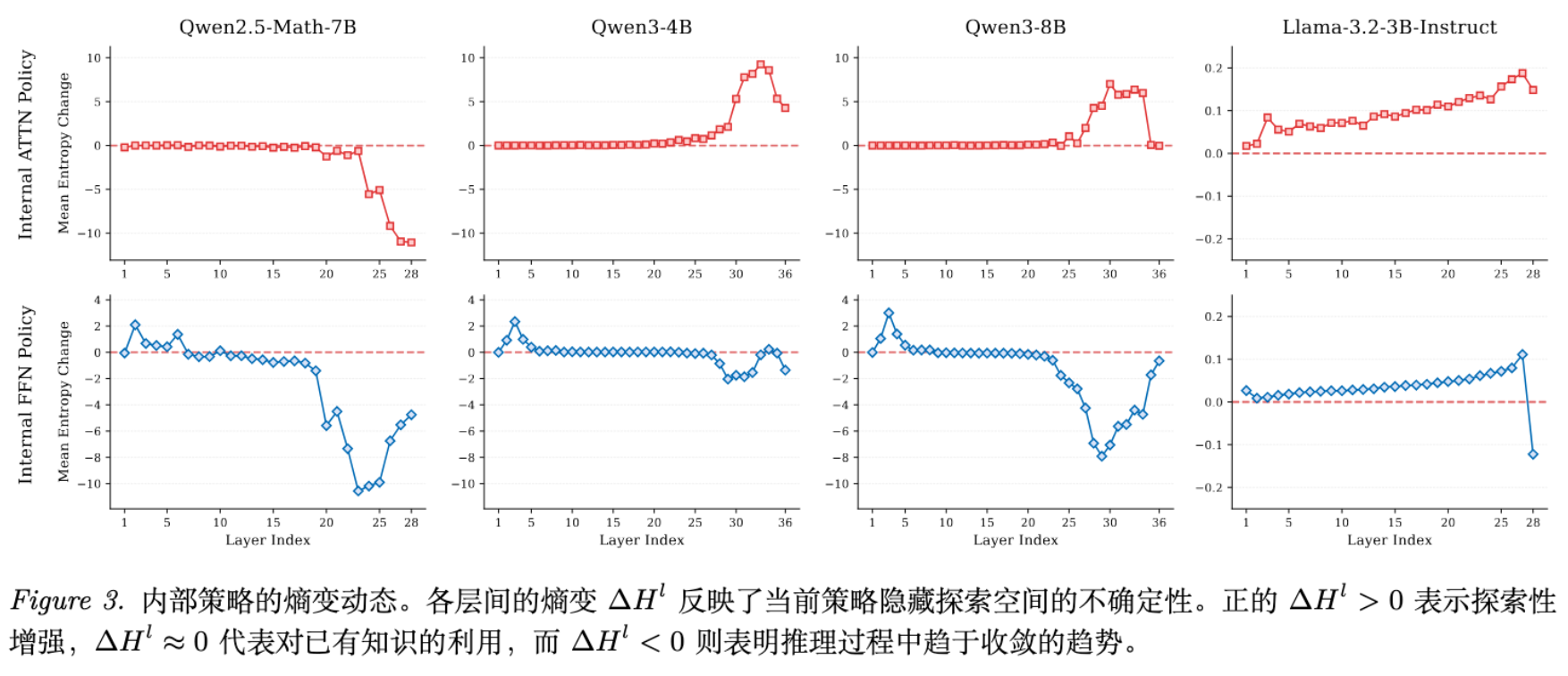Attention:在 Qwen3 中,Self-Attention 持续表现出正的熵变(),说明注意力机制主要负责引入上下文信息,扩大可能性的边界。 -