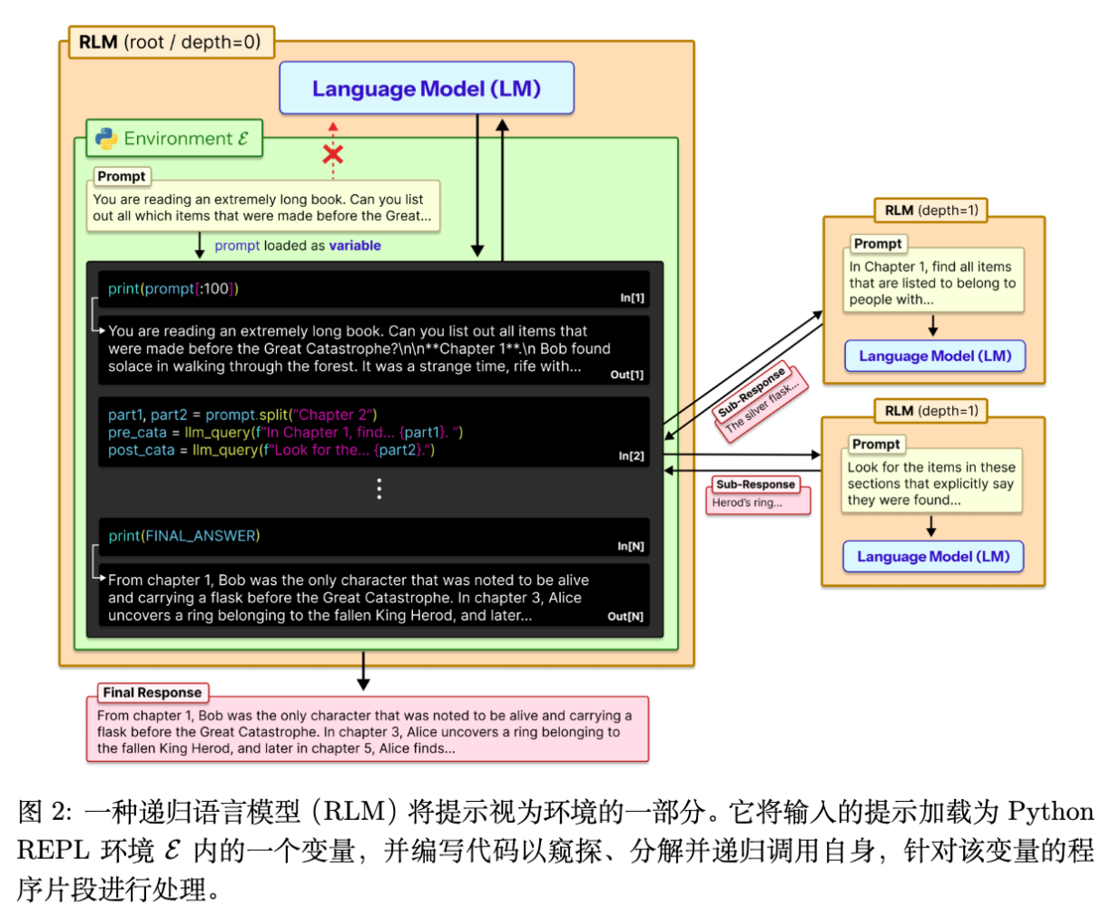 递归调用(Recursive Calling):即在代码中构造子任务,并调用 llm_query函数,该函数会启动一个新的 LLM 实例(可能是同一个模型,也可是更小的模型)来处理子任务。