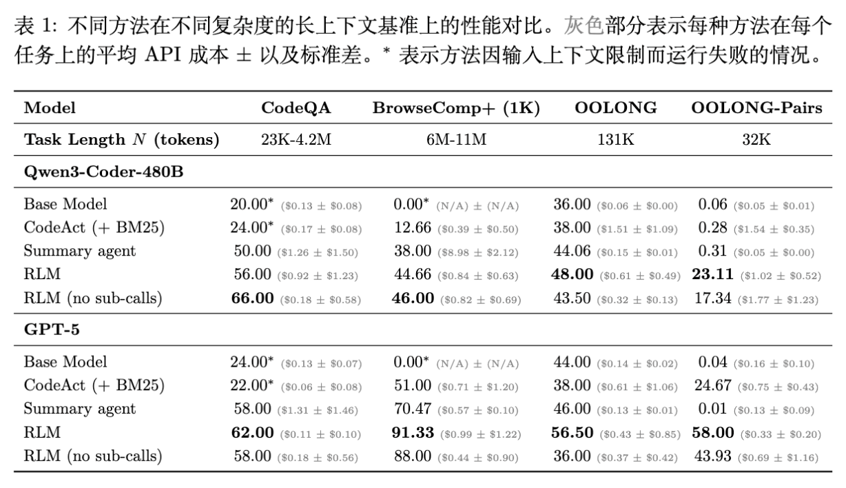 在 Qwen3-Coder 上,无子调用的版本甚至优于完整版 RLM(66.00% vs 56.00%)。这说明对于某些“大海捞针”类任务,只要能用代码进行字符串搜索和切片,不需要额外的 LLM 推理,甚至能避免子模型带来的“幻觉”或级联错误。