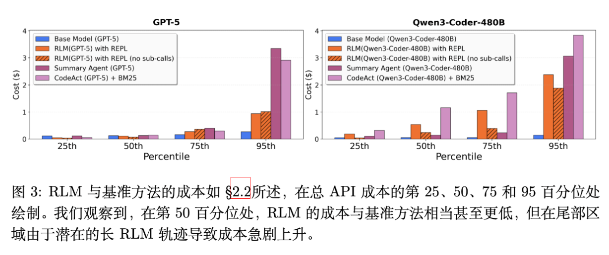 如[图 3 中文标题]所示,虽然中位数成本很低,但在长尾部分(95th percentile),RLM 的成本会急剧上升。这是因为对于某些困难的 query,RLM 可能会陷入较长的探索循环,或者发起大量的子调用。相比之下,Summary Agent 的成本是确定性的(读取所有 Token)。