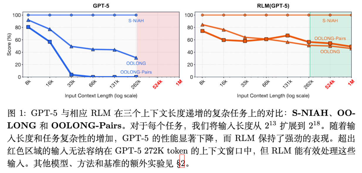 如图 1 左侧所示,即便是像 GPT-5 这样的前沿模型,随着输入长度的增加,其性能也会迅速下降。这种下降不仅取决于长度,还取决于任务的复杂度。虽然通过改进训练、架构(如 Ring Attention 等)和基础设施,上下文长度在稳步提升,但一个核心问题依然存在:是否可能通过推理时的手段,将通用 LLM 的有效上下文规模扩大数个数量级?