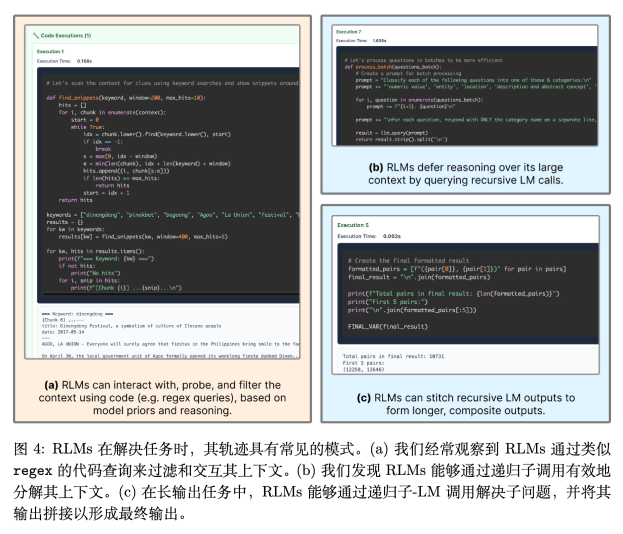 RLM 的强大不仅在于架构,更在于模型在 REPL 环境中展现出的自适应行为。作者通过定性分析,总结了几种关键的涌现模式(Emergent Patterns)。