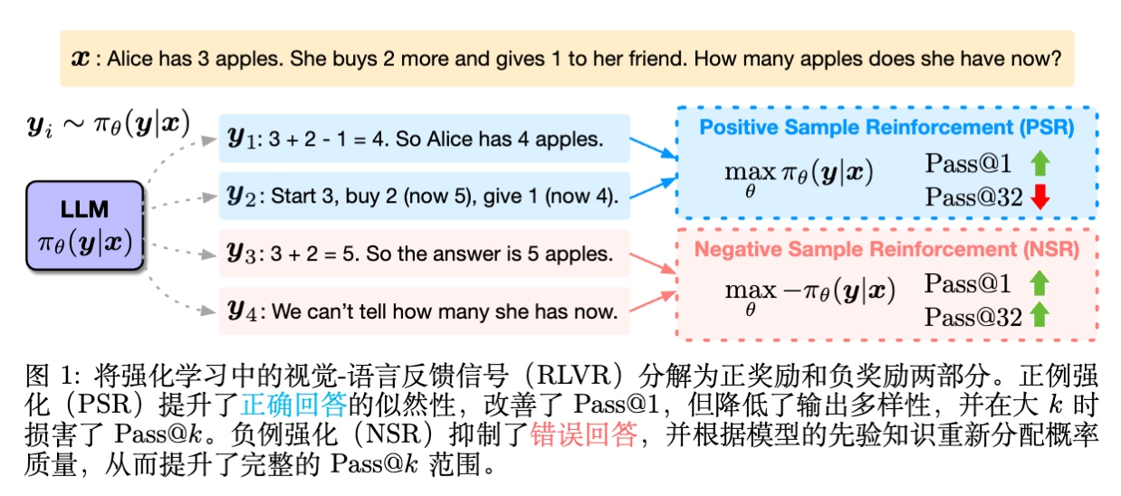 分解视角:作者将 RLVR 的学习信号分解为正样本强化(PSR,即奖励正确答案)和负样本强化(NSR,即惩罚错误答案)。 -