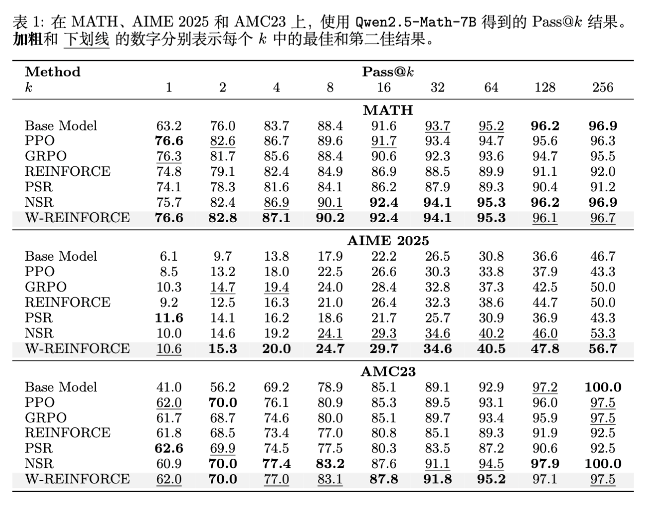 在 AIME 2025 和 AMC23 上,W-REINFORCE 展现了更强的一致性优势,特别是在 AIME 上,Pass@256 达到了 56.7,显著优于其他所有方法。