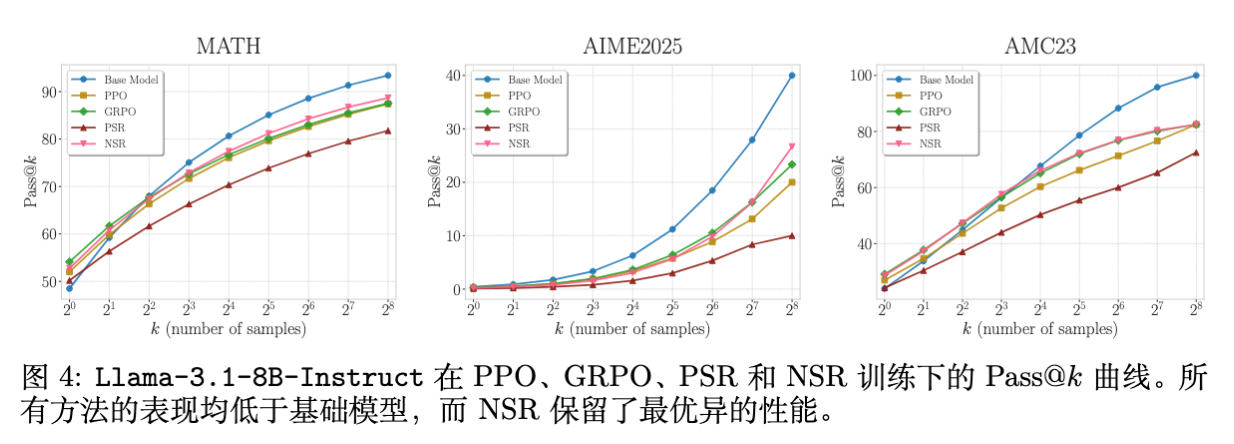 在 Llama-3.1 上,所有 RL 方法相对于 Base Model 都有所退化(特别是在高 处)。这与近期一些关于 RL 在某些 Base Model 上可能导致 Inference scaling 性能下降的研究一致(如 RLOO 等论文的观察)。但在所有 RL 方法中,NSR 导致的退化是最小的,再次证明了其在保持分布多样性方面的优势。