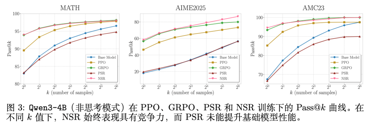 NSR 的强劲:NSR(粉线)虽然从未见过被强化的“正确答案”,但其性能曲线在整个 值谱系上都表现出色。在 时,NSR 甚至超过了 PPO 和 GRPO。 -