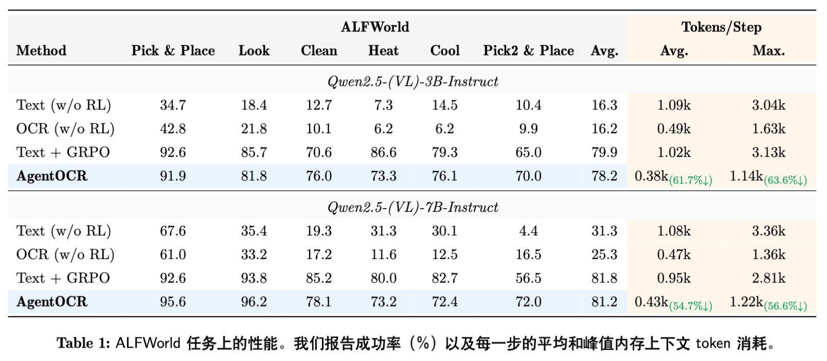 在 ALFWorld 上,AgentOCR 相比 Text 基线减少了约 61.7% (3B) 和 54.7% (7B) 的平均 Token 消耗。 -