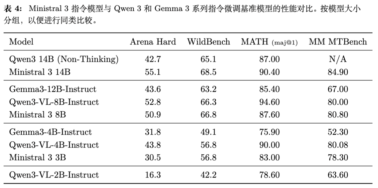 在指令微调后,Ministral 3 在 Arena Hard、WildBench 等对齐基准上表现优异。特别是 Ministral 3 14B 在 MATH (maj@1) 上达到了 90.40% 的准确率,优于同尺寸的 Qwen 3。